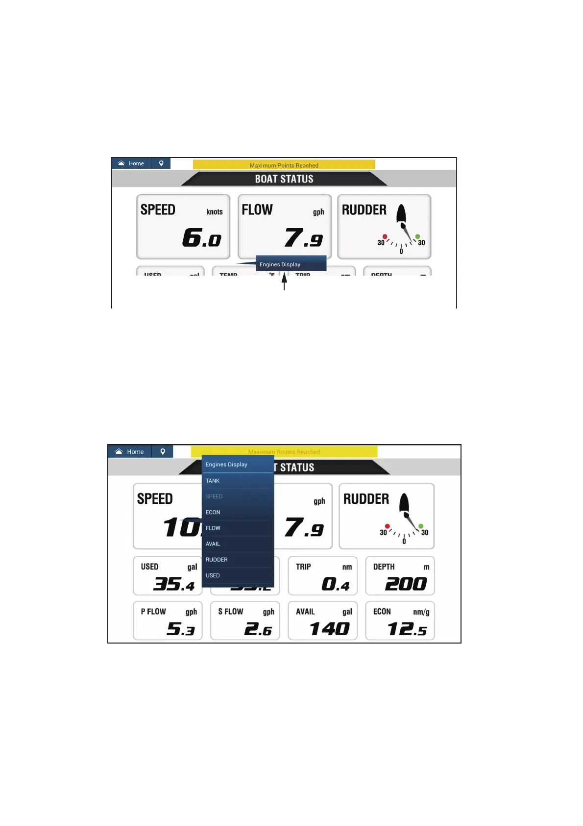 shows the pop-up menu available with the boat status display.