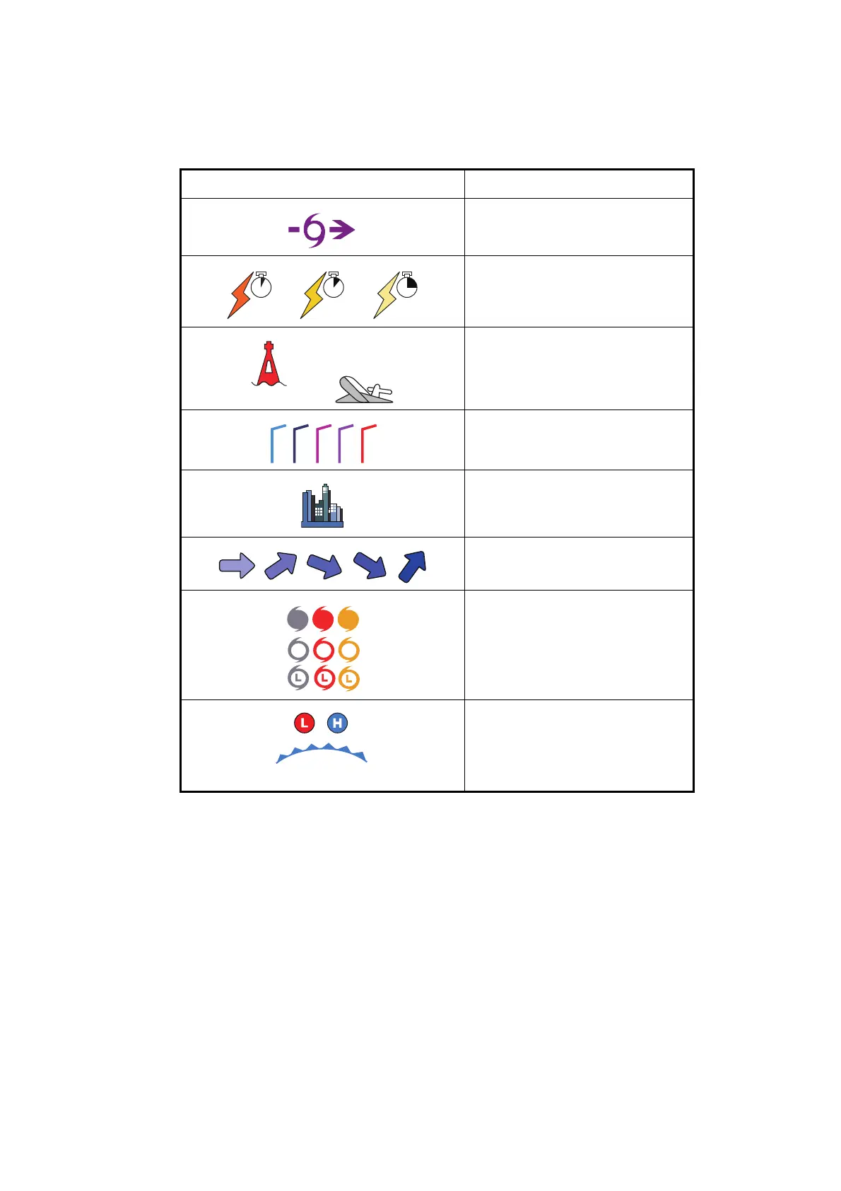 The table below shows the weather icons that appear on the SiriusXM weather dis-