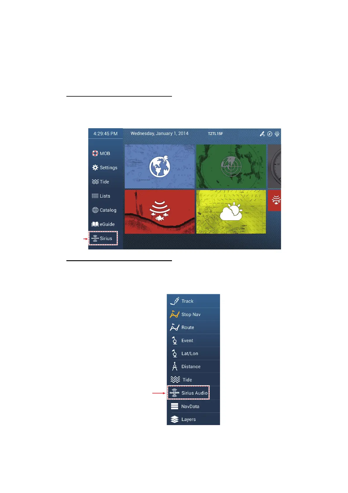 Open the slide-out menu, then tap the [Sirius Audio] icon to show or hide the audio