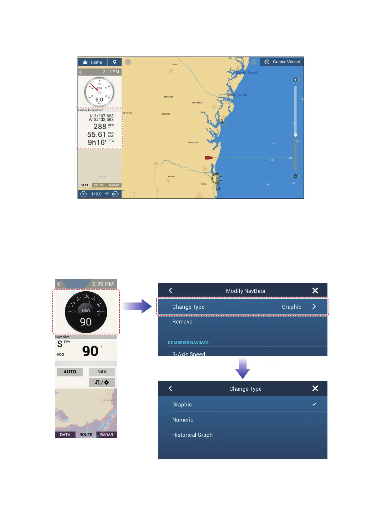 Tap the data box for which to switch the indication, and the [Modify NavData] menu