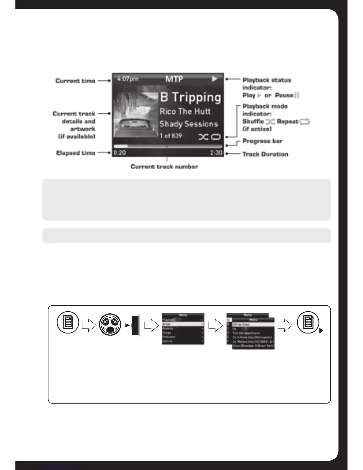 IPOD, MTP, BLUETOOTH AND USB SOURCE SCREENS
