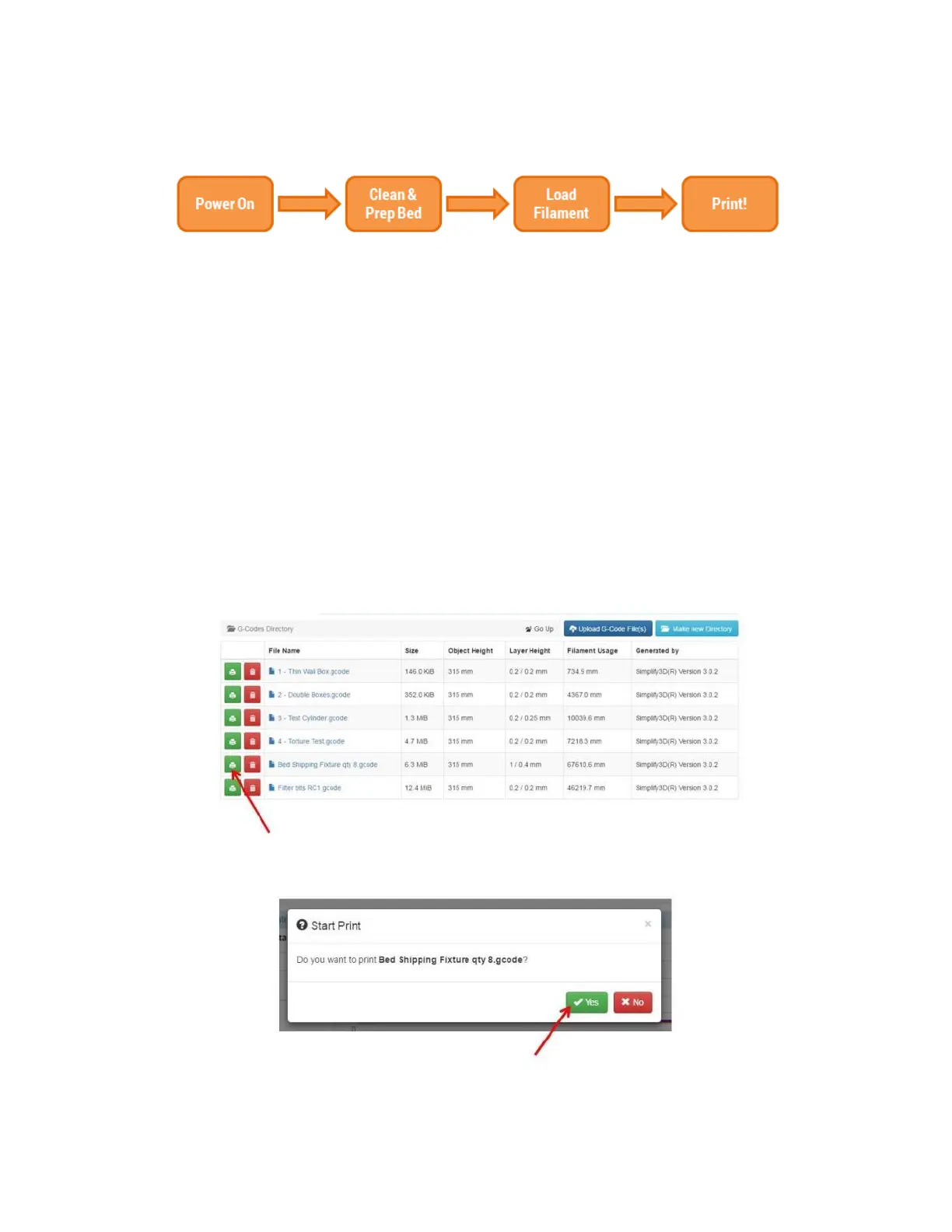 Log onto the web interface and navigate to the “Gcode files” tab. Locate the file you wish to print and click the