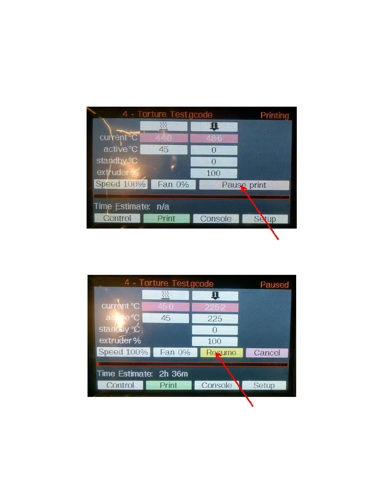 When you’re ready to continue printing, click “Resume”. The print head will move back to the part and continue