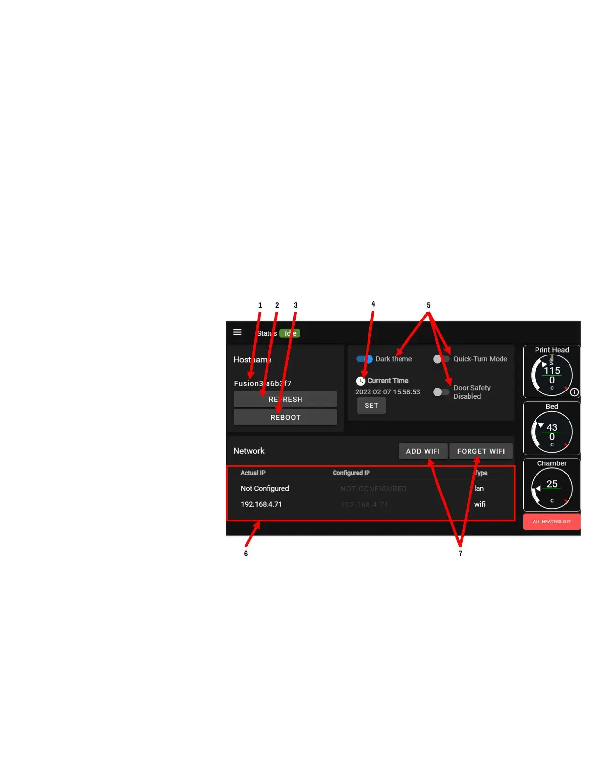 8. Axis position readout: Shows you where the printer thinks it is in 3D space. Note: if you have not