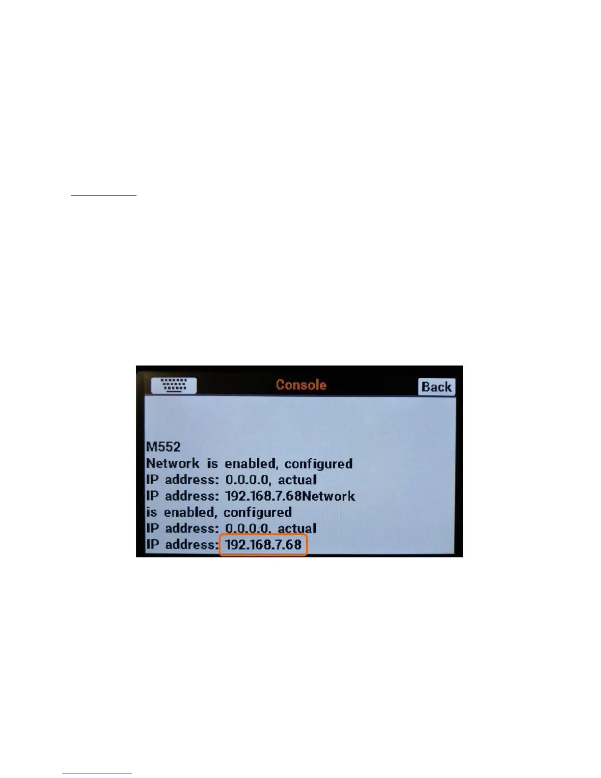2. Type in “M552” and press enter. Verify the printer’s IP address is not all 0s. If it is, that means it