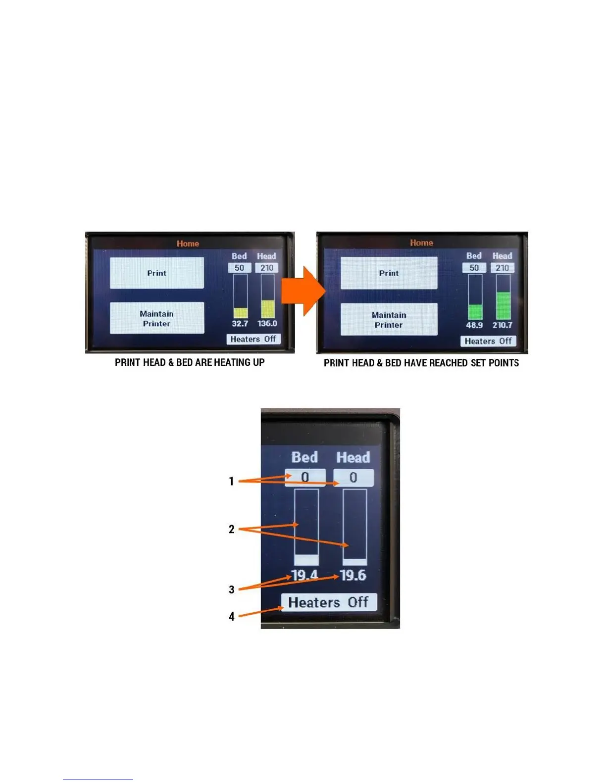 1. Current set point for bed and print head (a set point of 0 means the heater is off)