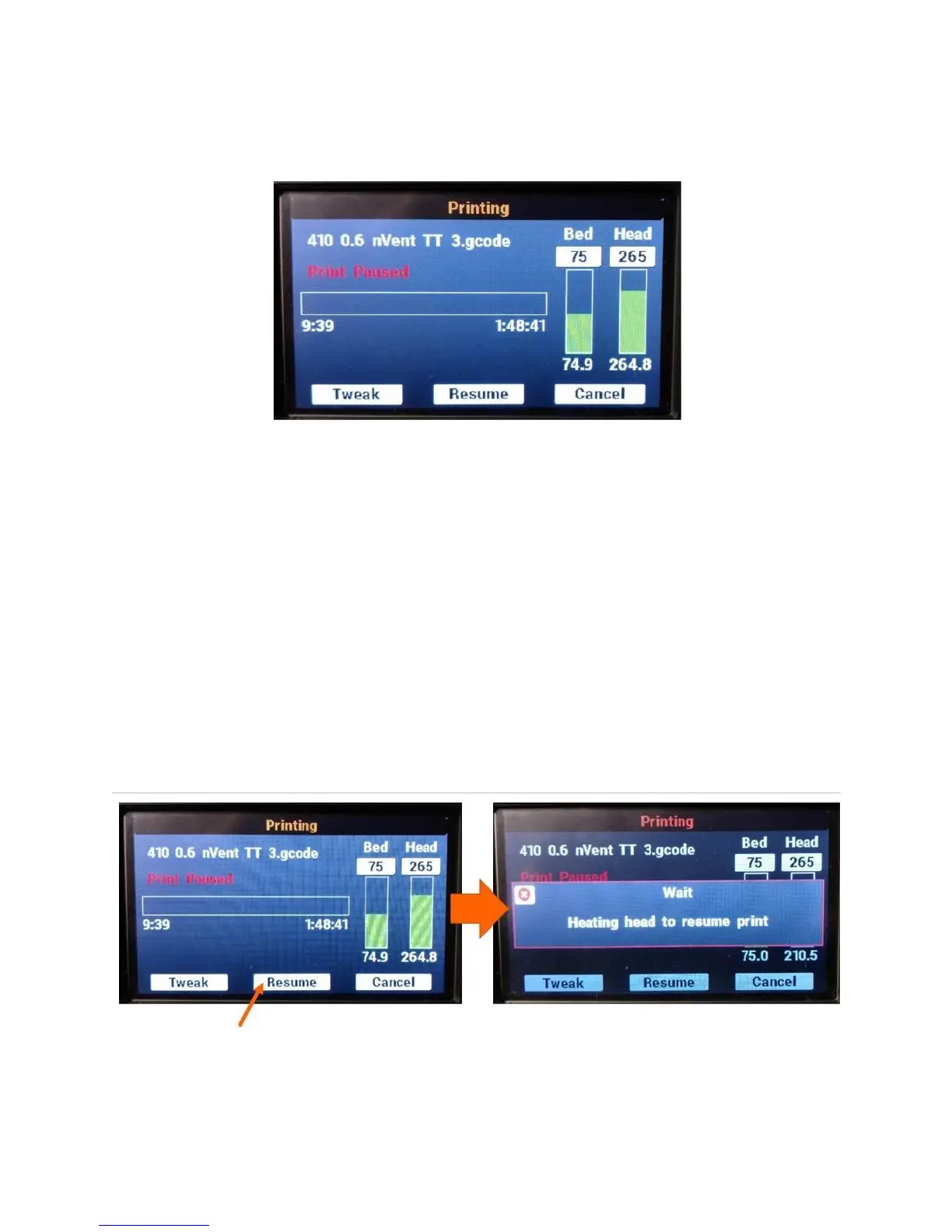 When you are ready to resume your print, press the Resume button on the print progress screen.