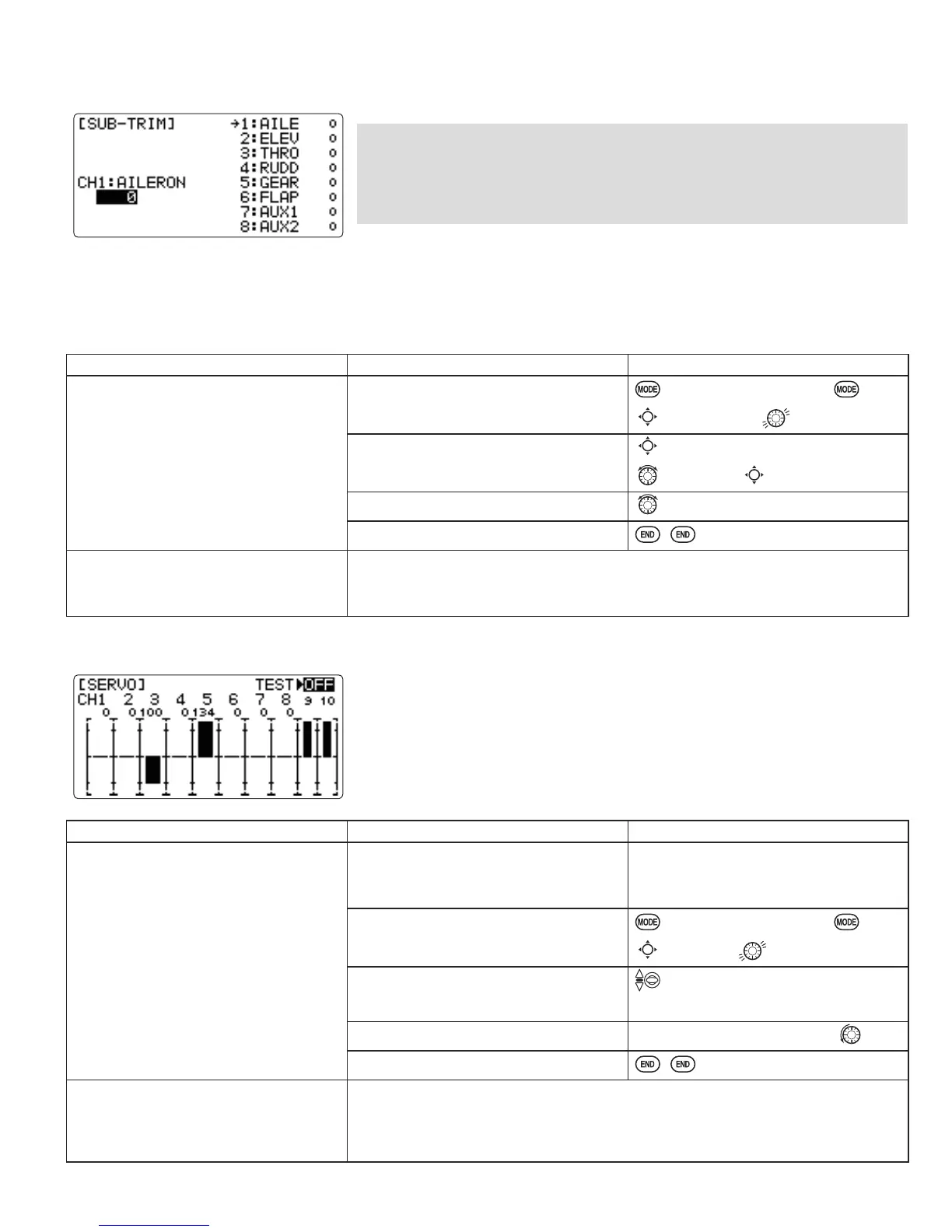 : makes small changes or corrections to the neutral position of each servo. Range is -120 to +120, with 0 setting,