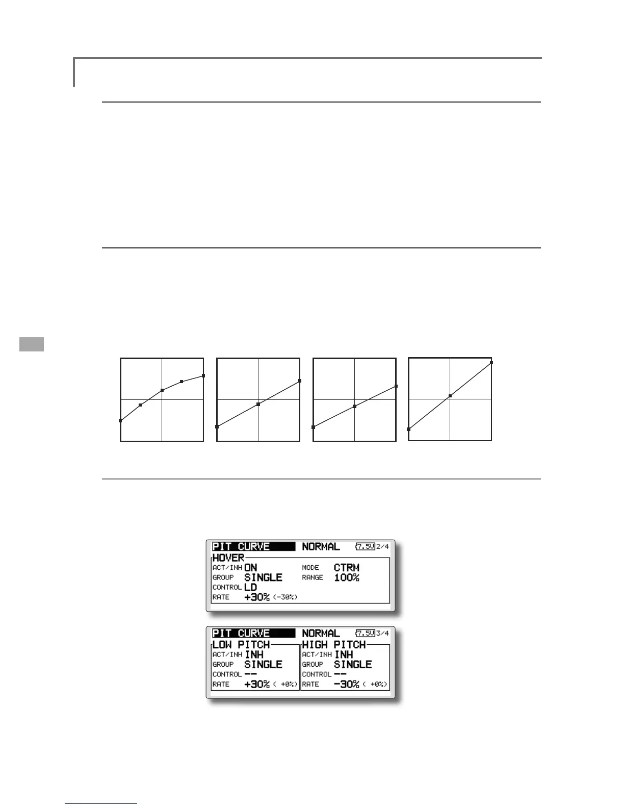 The hovering pitch, low pitch, and high pitch trim setup screen can be called from the PIT Curve setup