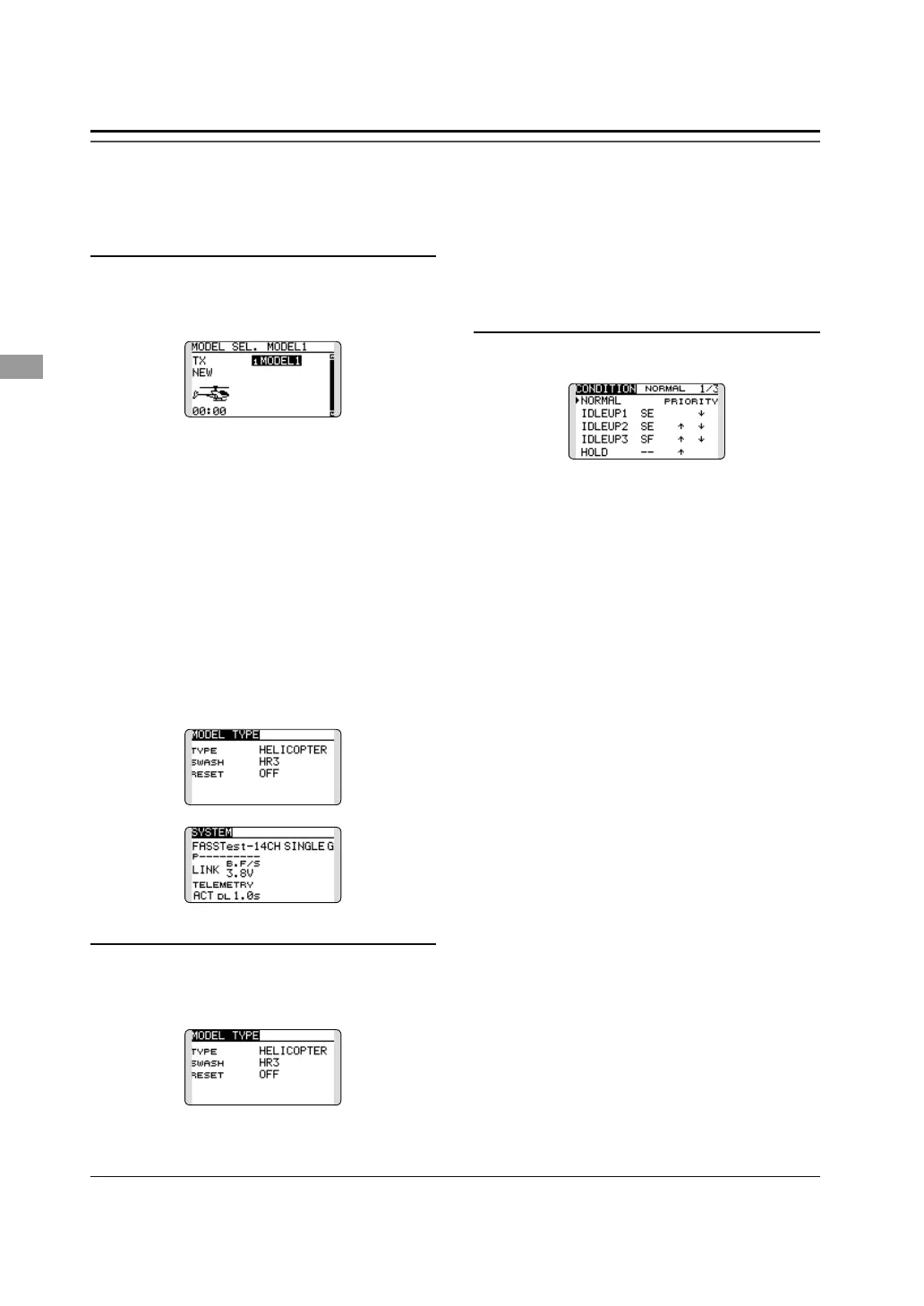 This section outlines examples of use of the helicopter functions of the T14SG. Adjust the actual values,