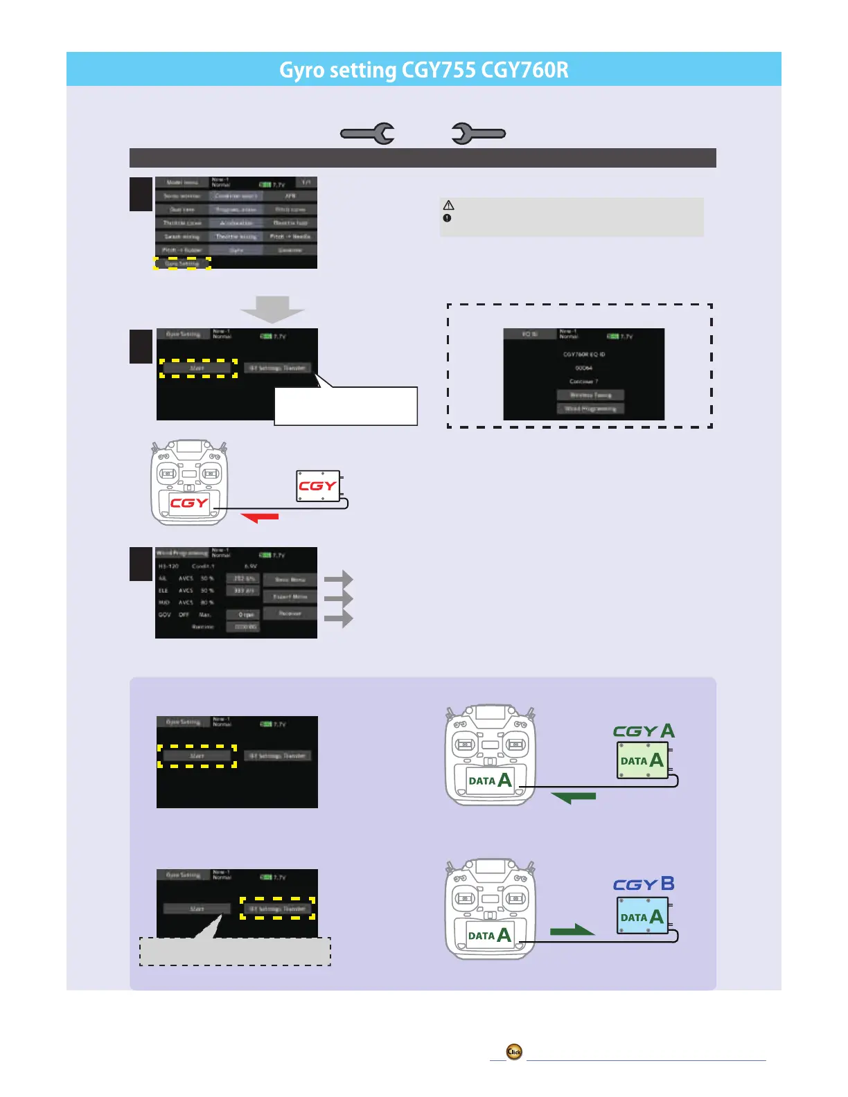 Connect the gyro A to the T16IZ and press [Start]. (Enter the data of A into T16IZ)