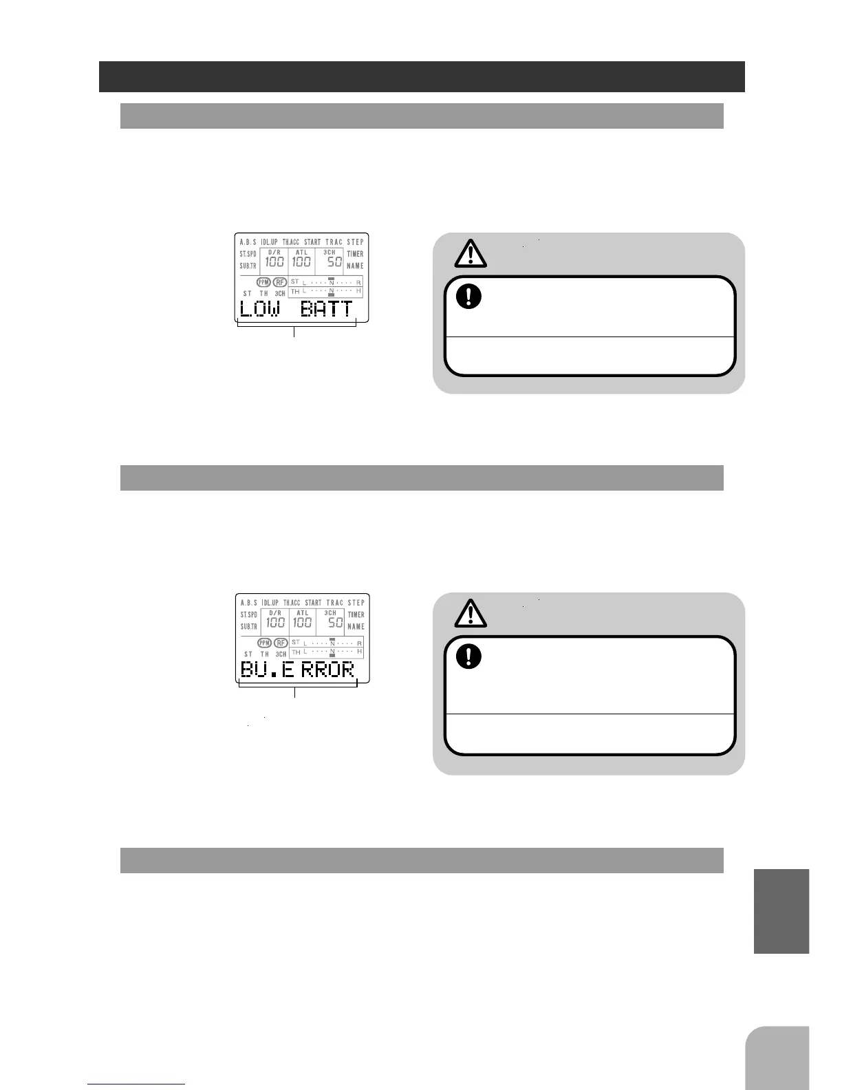 If the transmitter battery voltage drops to 8.5V or less, an audible alarm will sand and