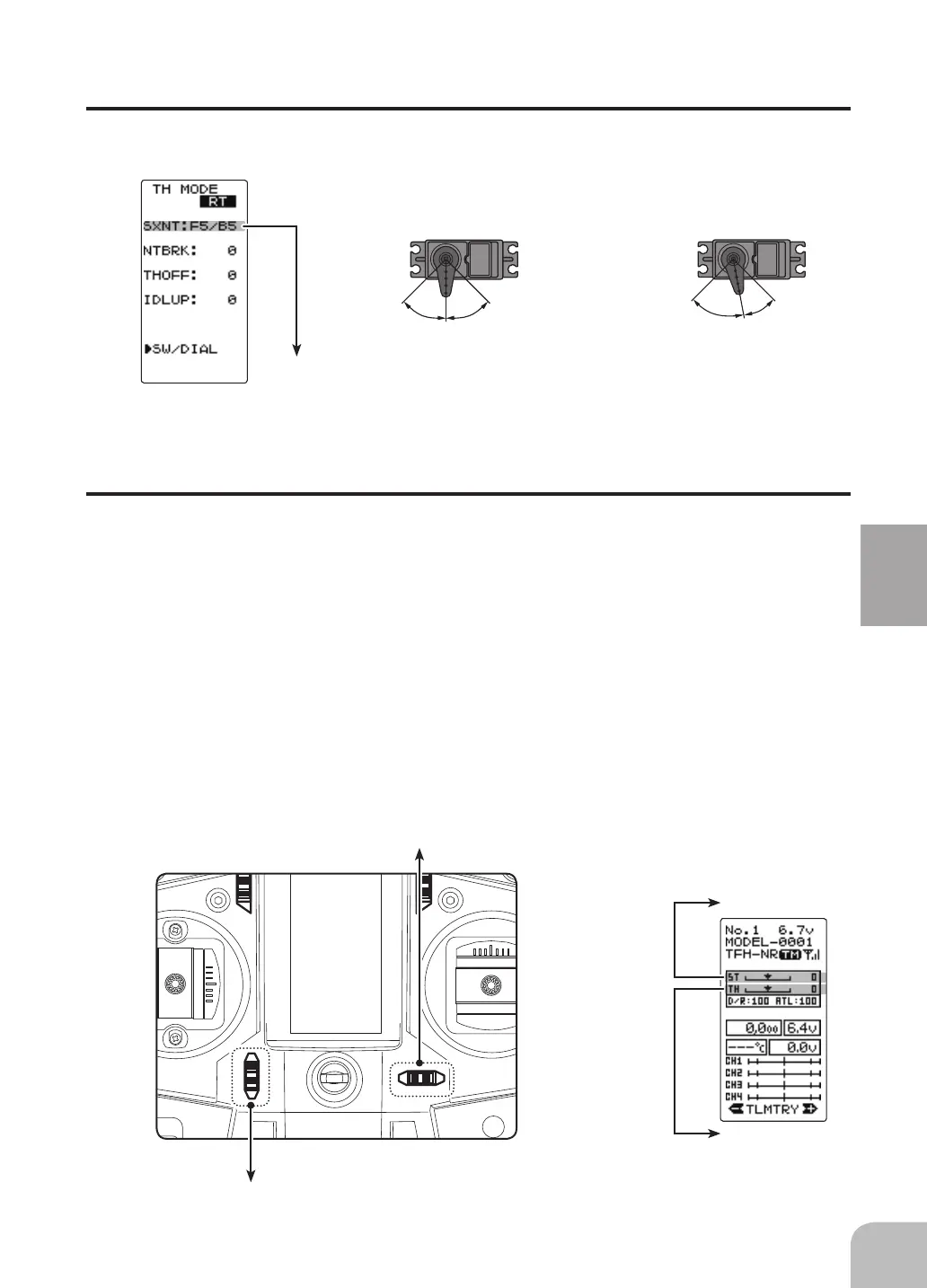 The throttle servo travel can be set to 5:5 or 7:3 for throttle stick operation as required
