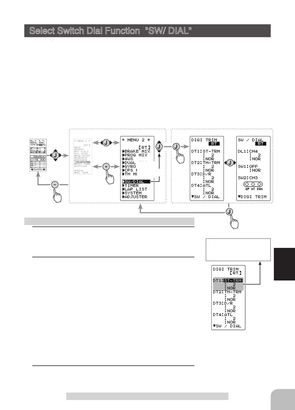 The functions that can be assigned to dial, digital trim and switch are listed on the next page.