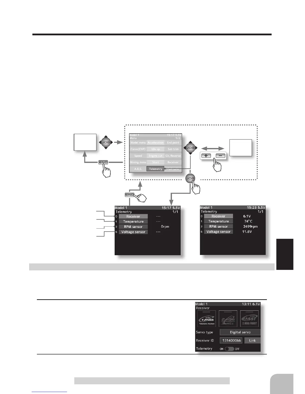 It is necessary to turn on the telemetry on the receiver setting screen to use the telemetry func-