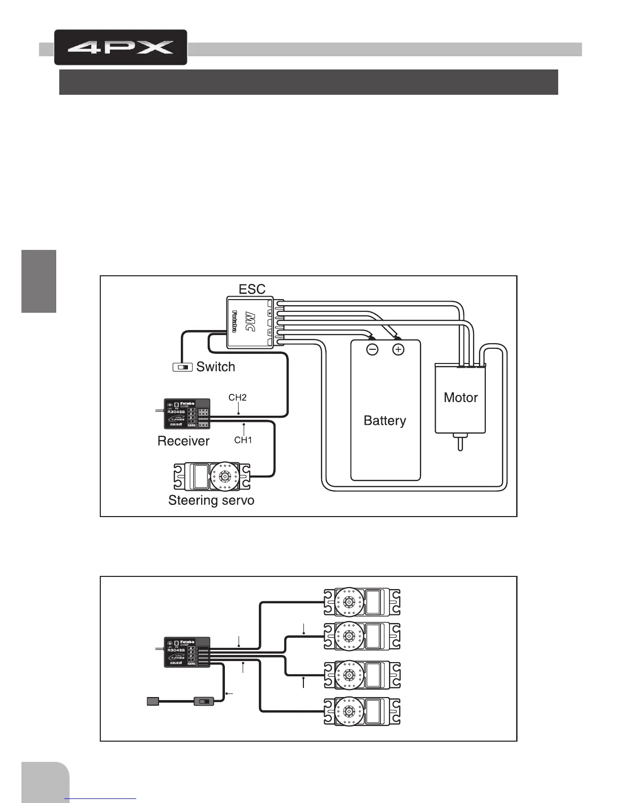 Connect the receiver and servos as shown below. Connect and install the receiver and ser-