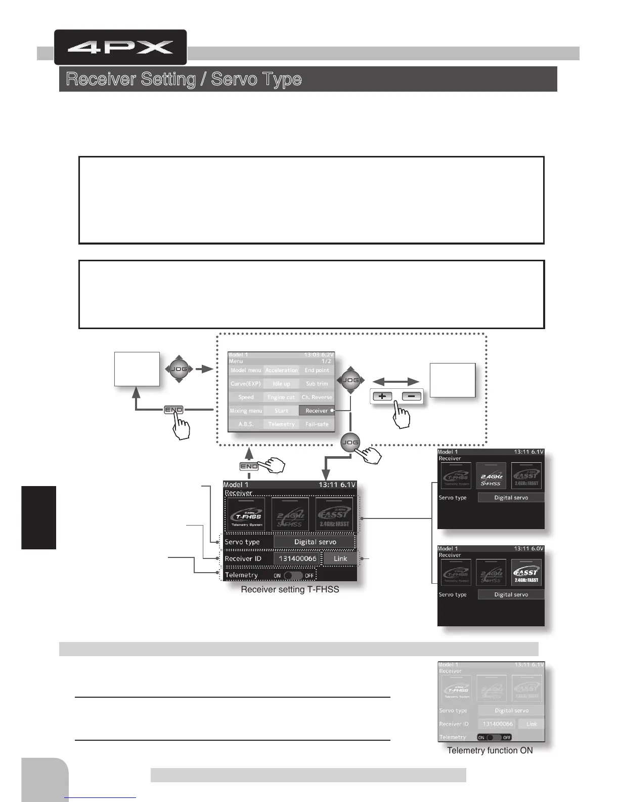 and the items selected at the T4PX, linking of the T4PX with the T-FHSS telemetry system,