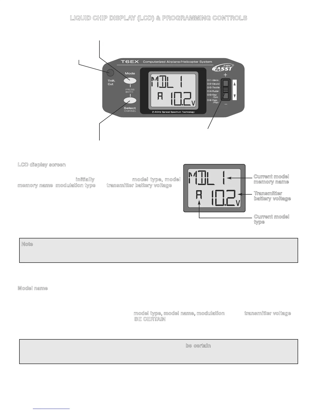 be indicated on the LCD screen. Before every flight BE CERTAIN that the correct model name for the model you intend to fly