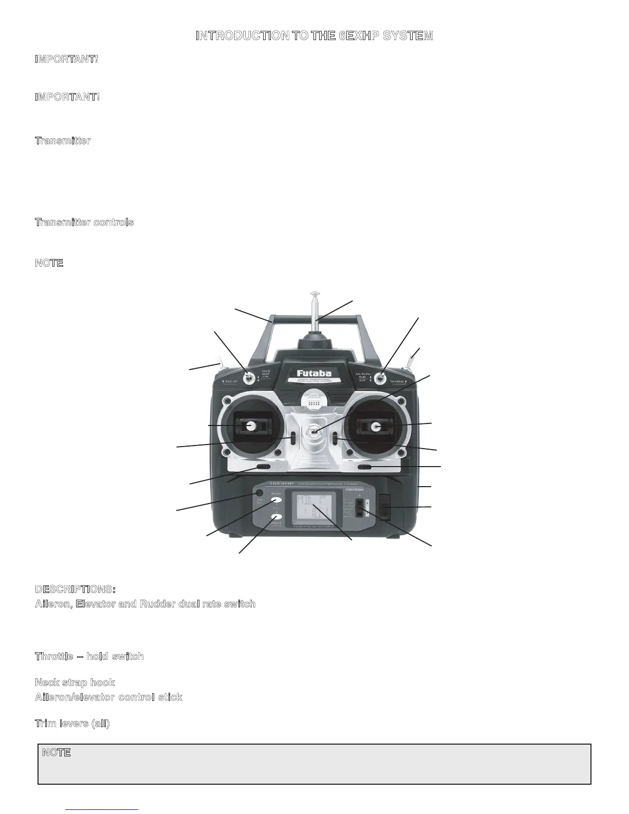 The diagram and explanations briefly describe the functions of the Futaba T6EXHP transmitter. Full instructions on how to