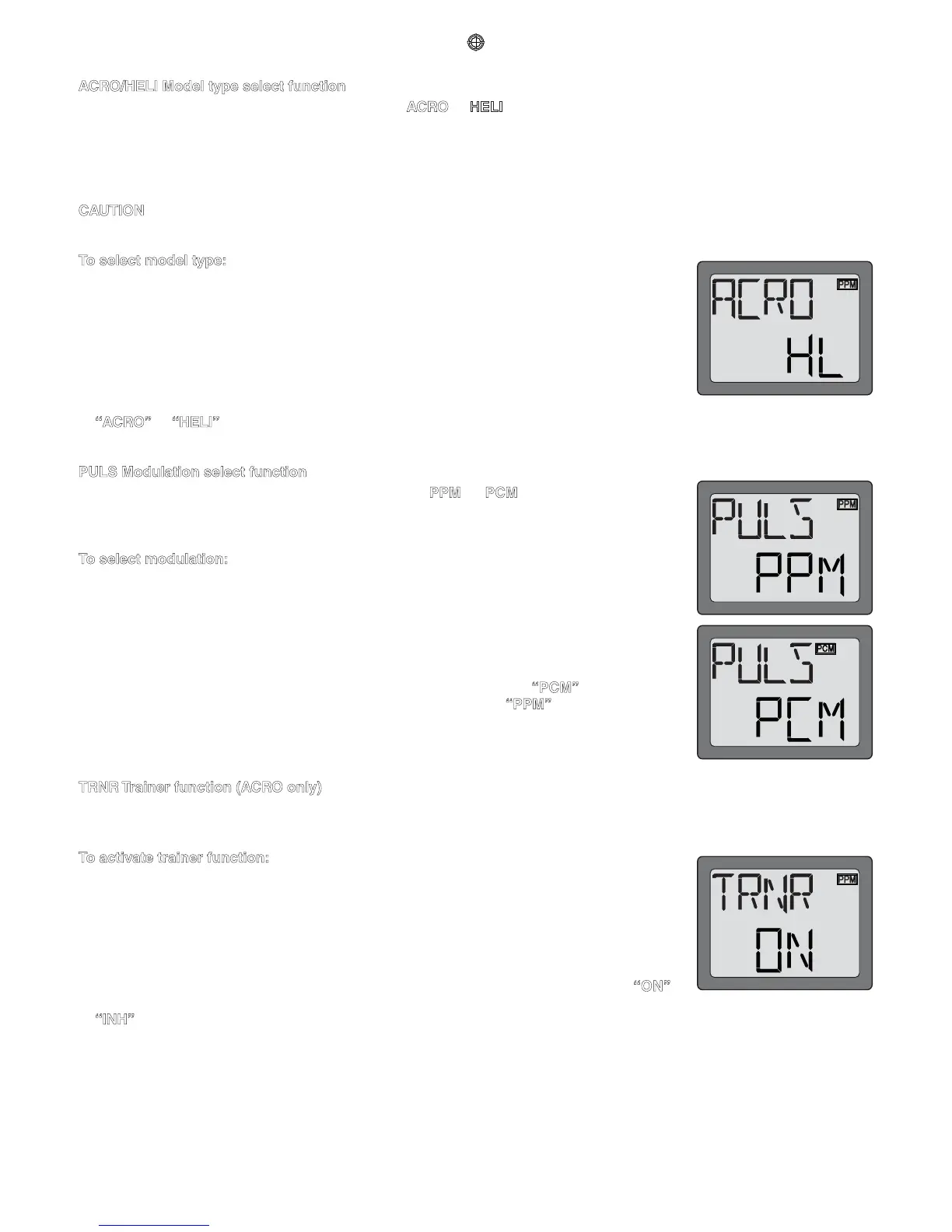 The Model type select function is used to select the ACRO or HELI mode of model type.