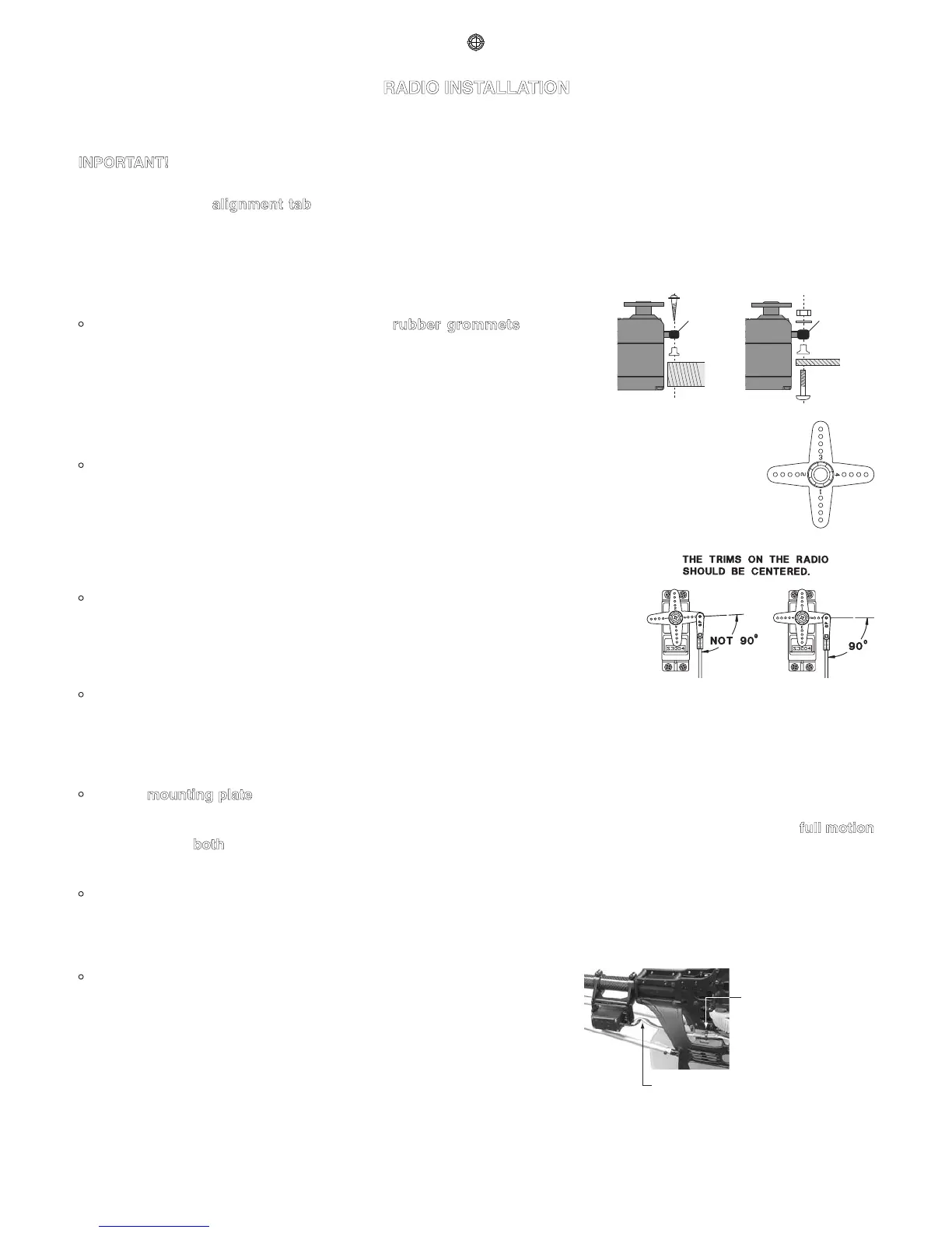 • After the servos are installed, operate each servo over its full travel and check that the pushrods and servo arms do not
