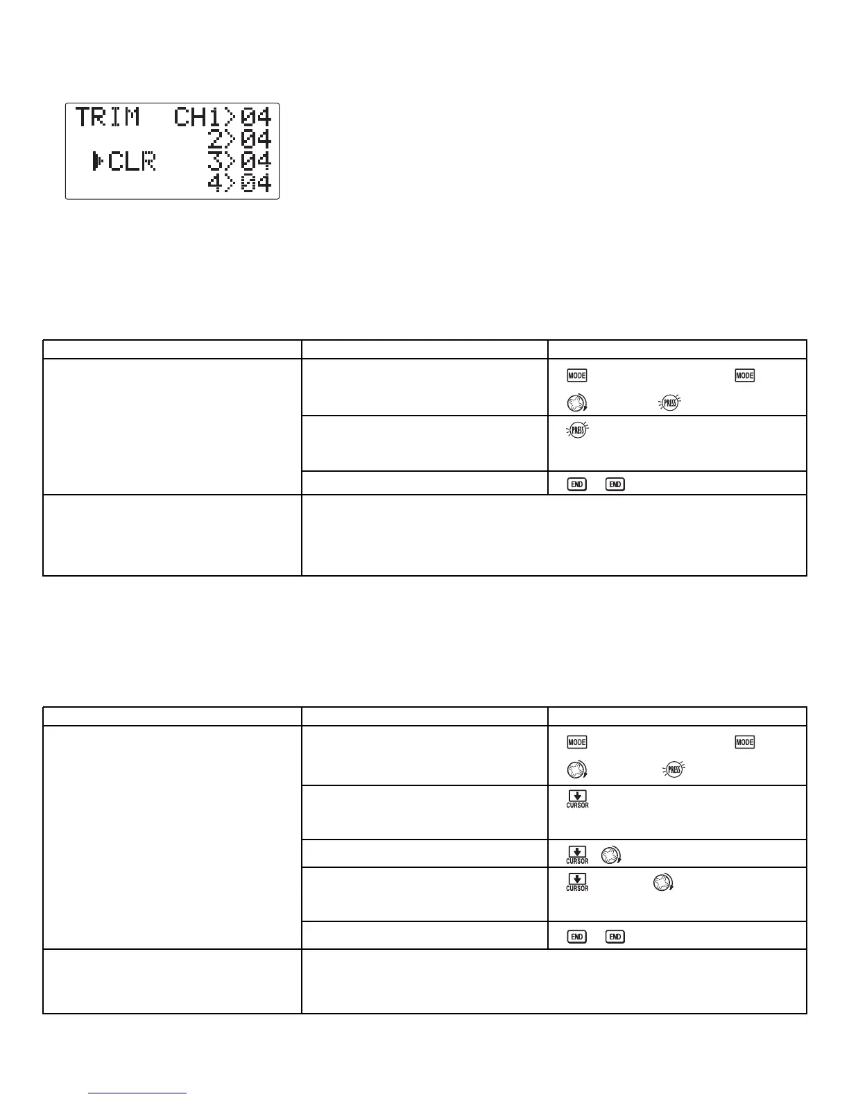 Trim reset (CLR): electronically centers the trims to their default values. Note that the SUB-TRIM settings and the trim