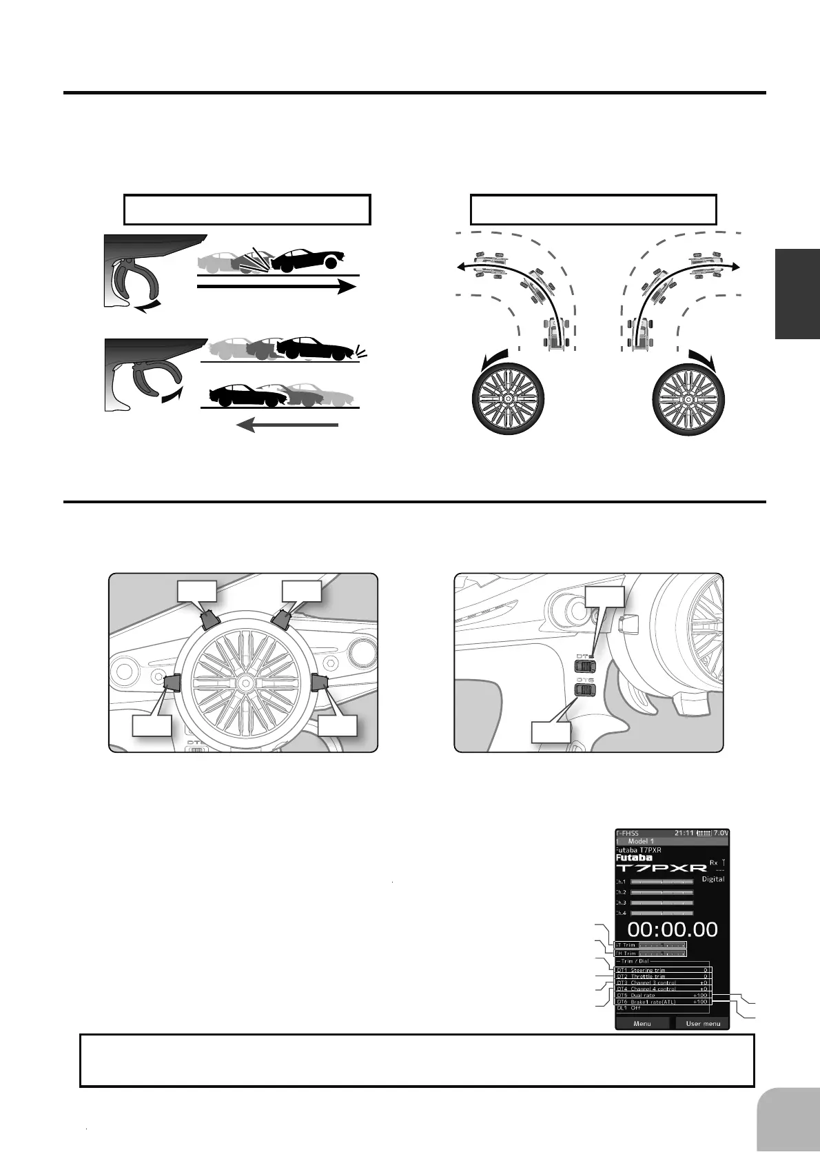 (Initial settings: DT1: Steering trim, DT2: Throttle trim, DT3: Channel 3, DT4: Channel 4, DT5: Steering D/R, DT6: ATL-Brake rate)
