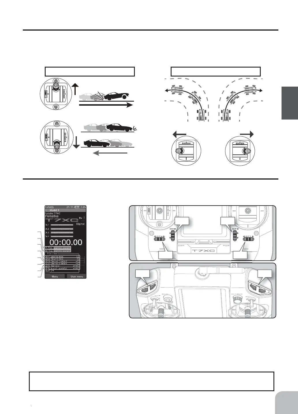 (Initial settings: DT1: Steering trim, DT2: Throttle trim, DT3: Channel 3, DT4: Channel 4, DT5: Steering D/R, DT6: ATL-Brake rate)
