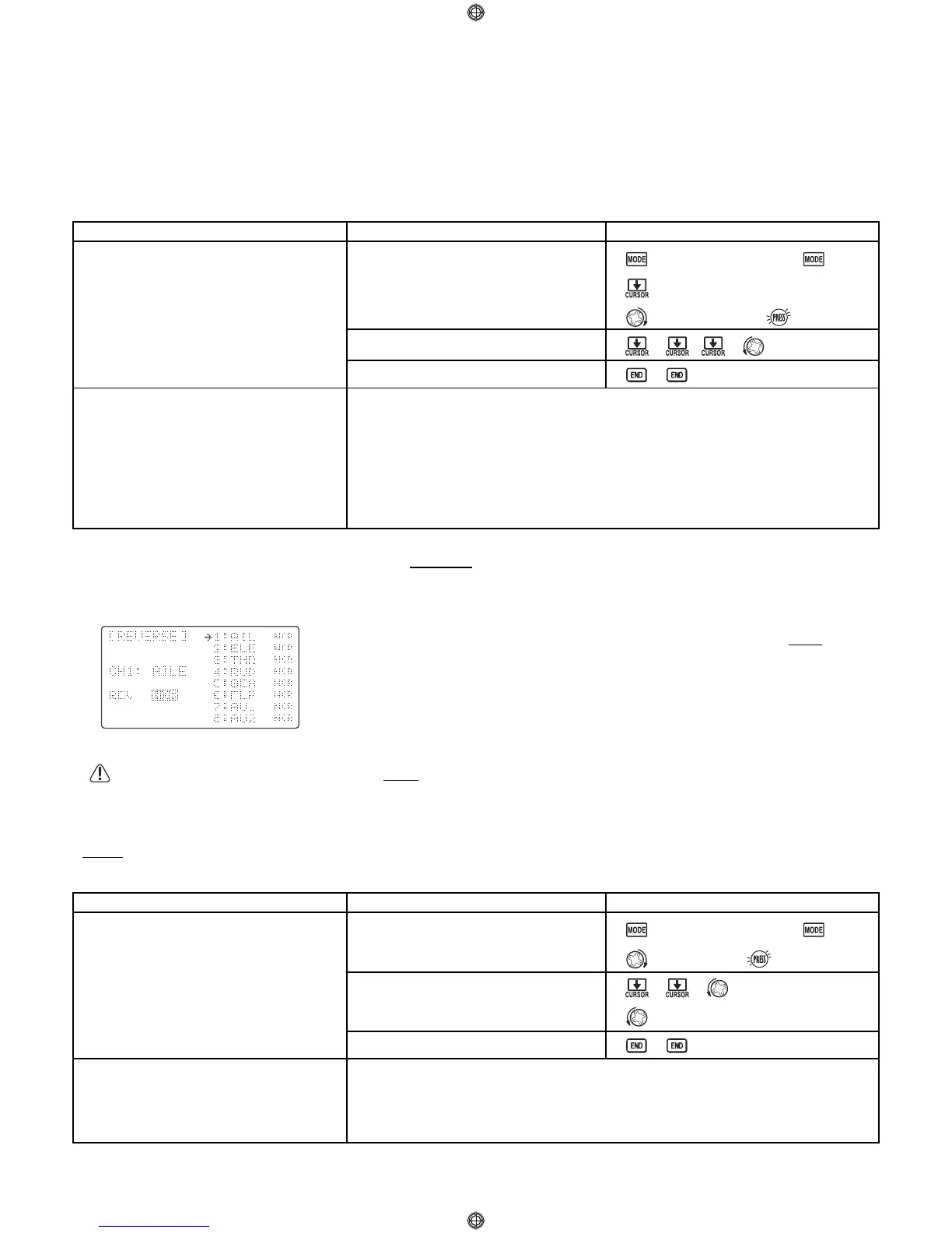 Stick’s upper half. To use THR-REV, turn off the transmitter, hold down the MODE and END keys, turn on. CURSOR DOWN to