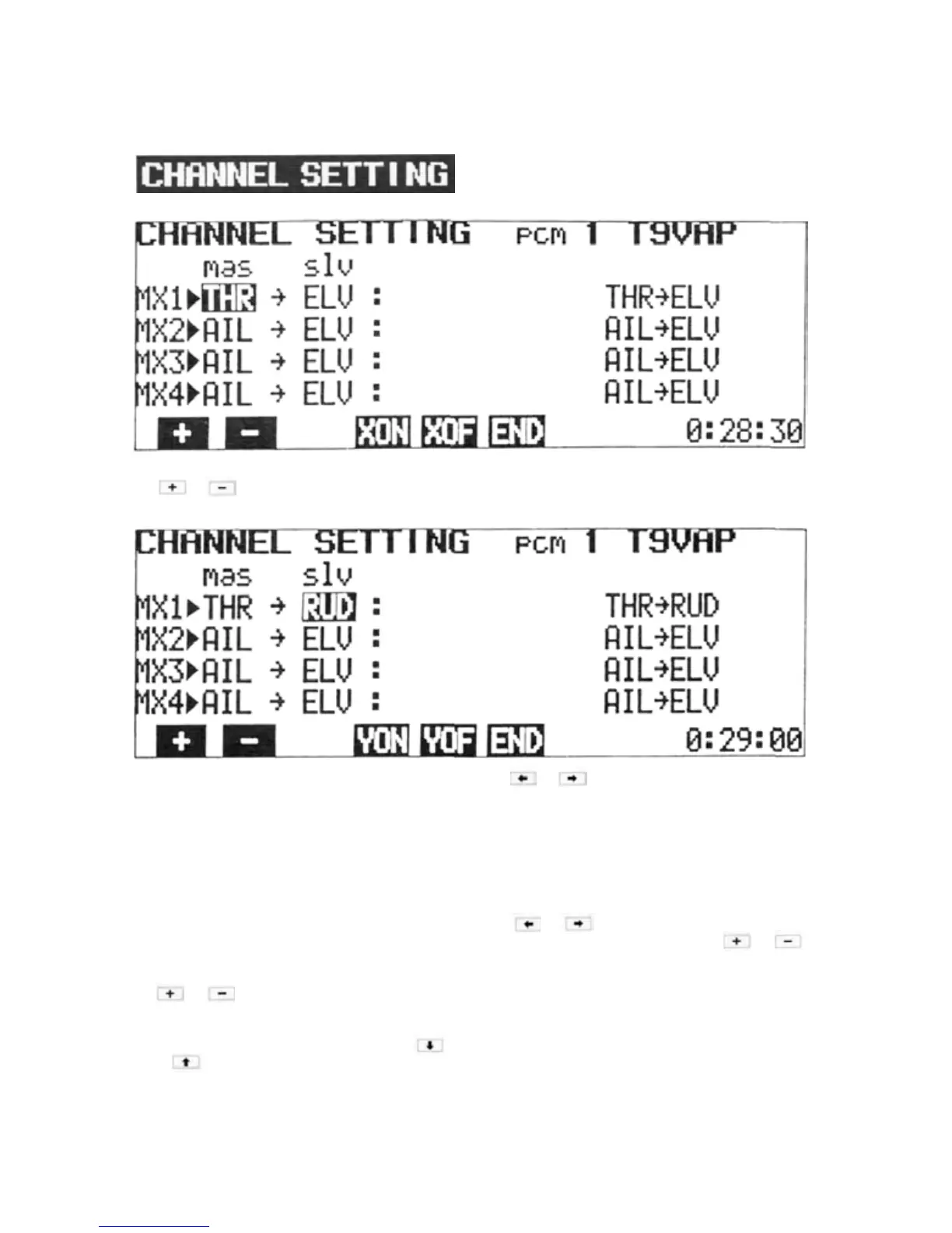 In the first example shown, THR (Throttle) is set at "mas". The Master channel can be changed by pressing