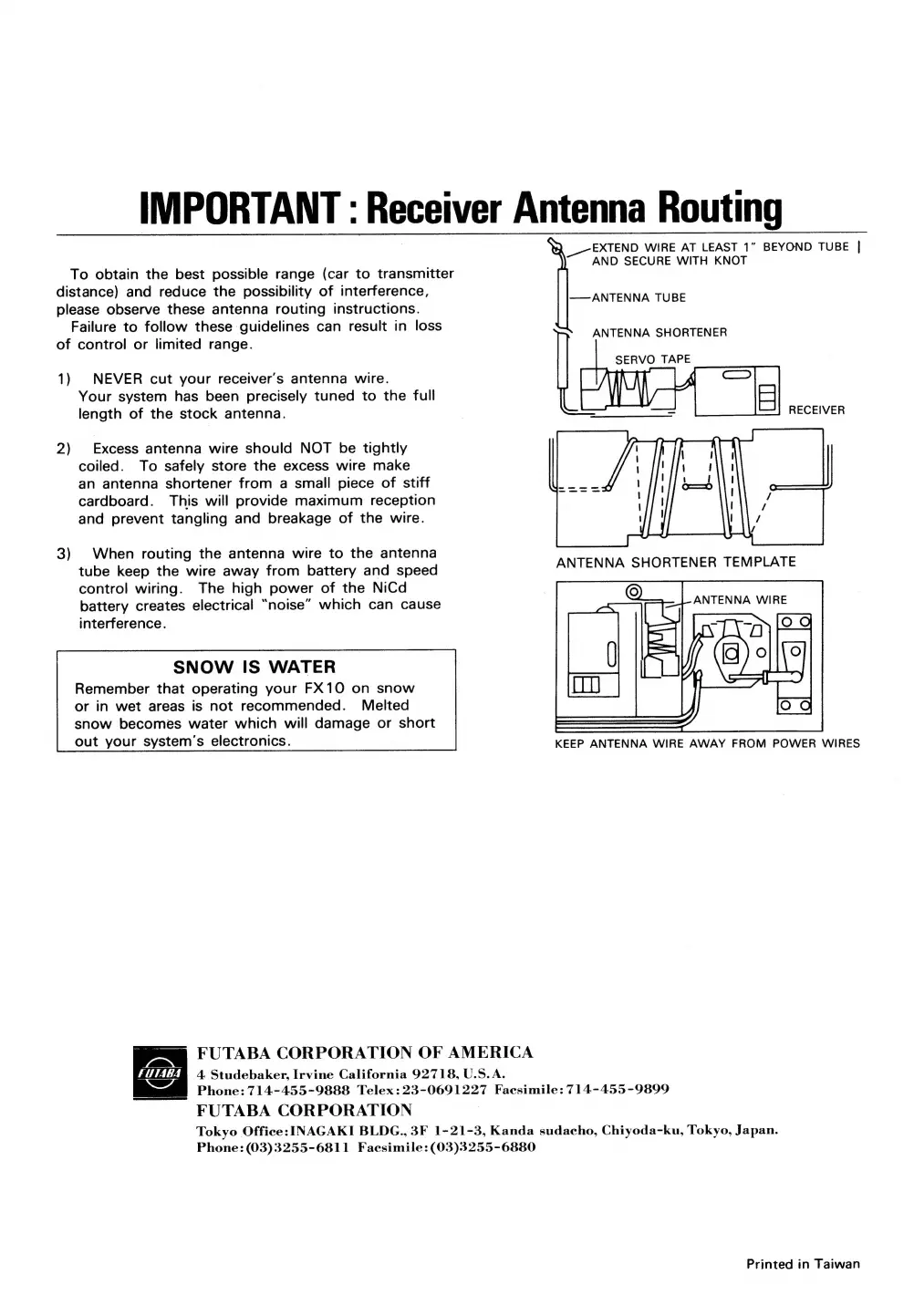 FUTABA FP-2PB - Important: Receiver Antenna Routing; Antenna Routing Guidelines; Snow Is Water