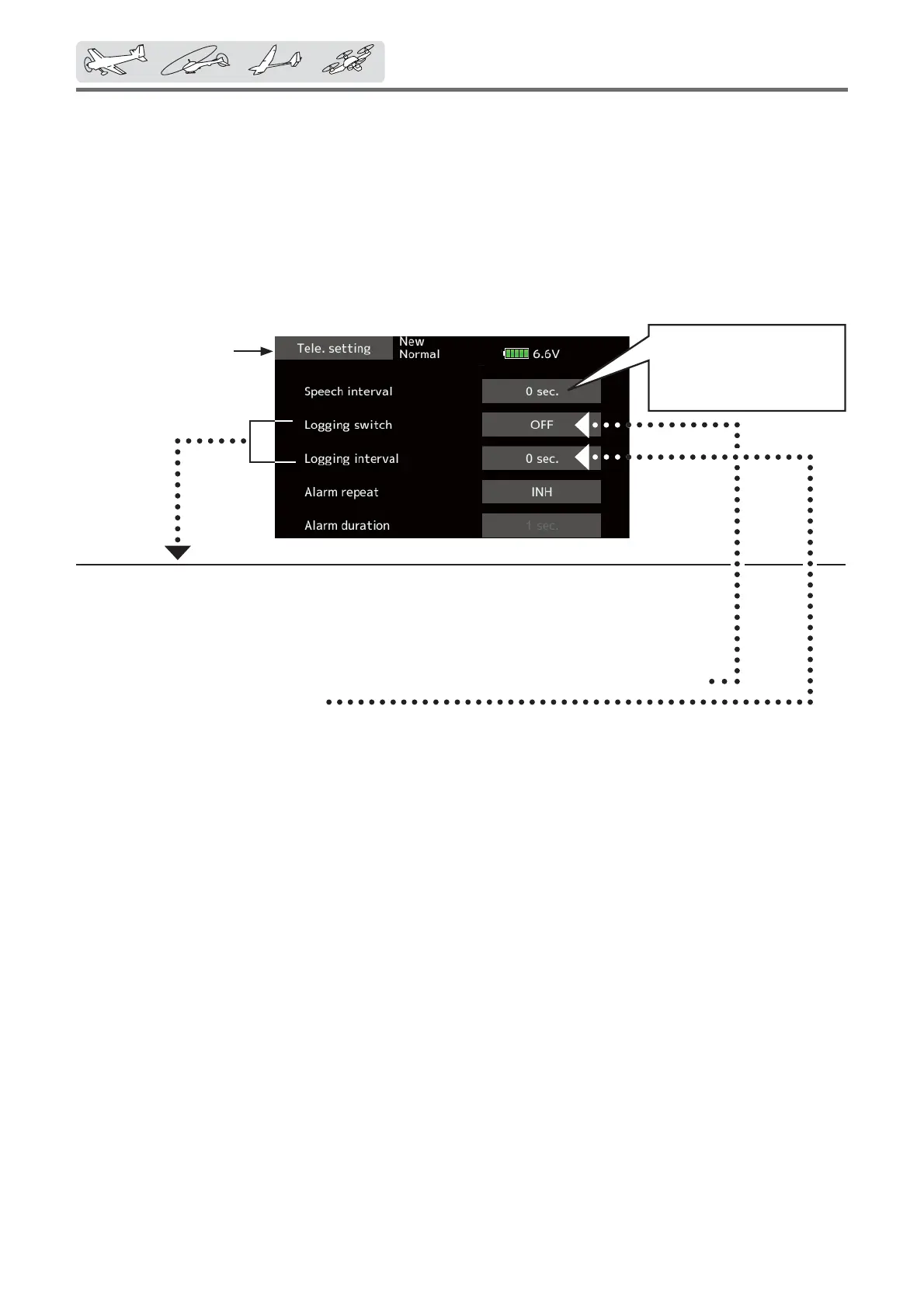Set the switch set by Logging switch to OFF. A beeping sound is generated and recording of the telemetry data stops.