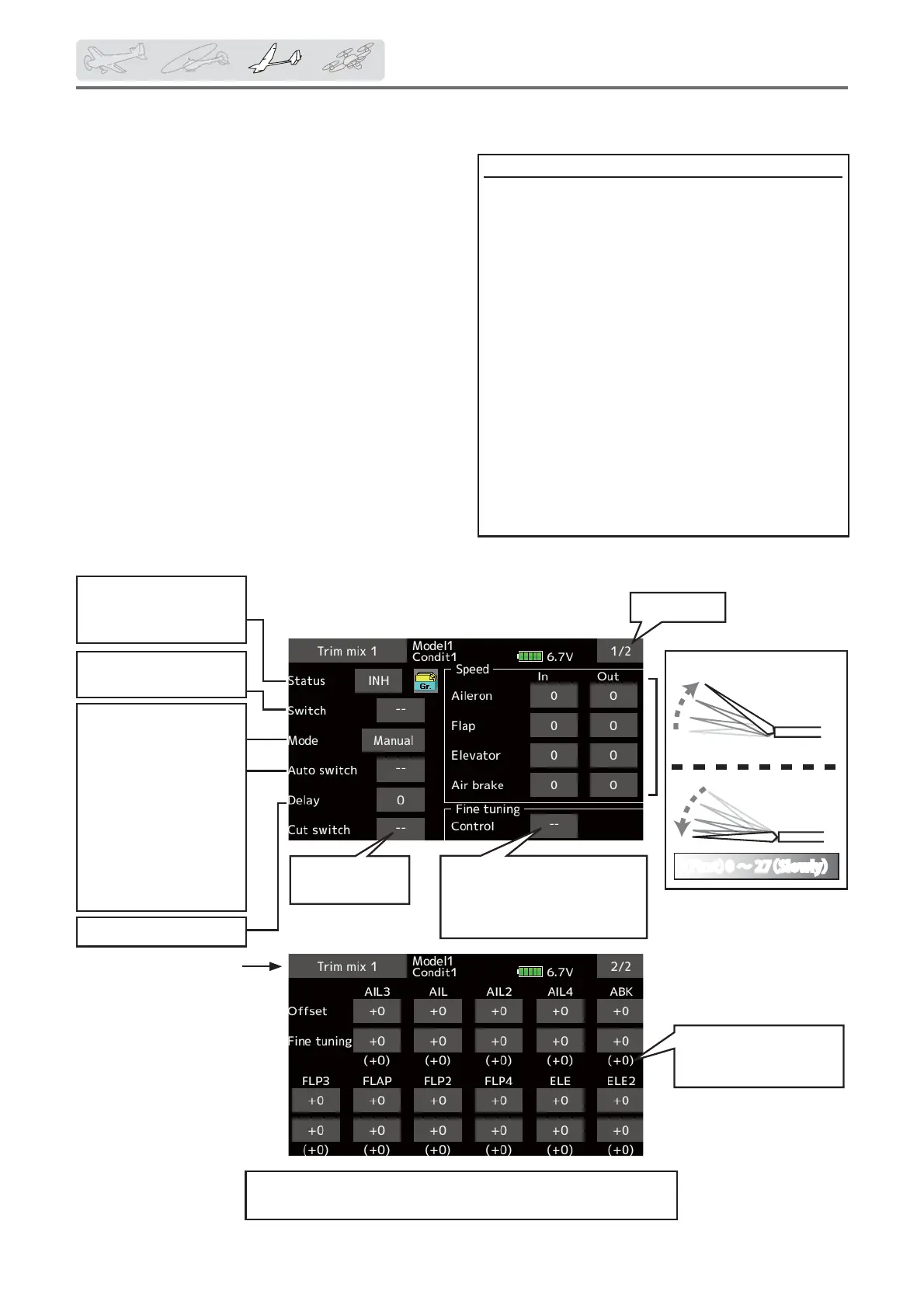Theoffsetrateofailerons,flapsandelevatorscanbeadjusted.