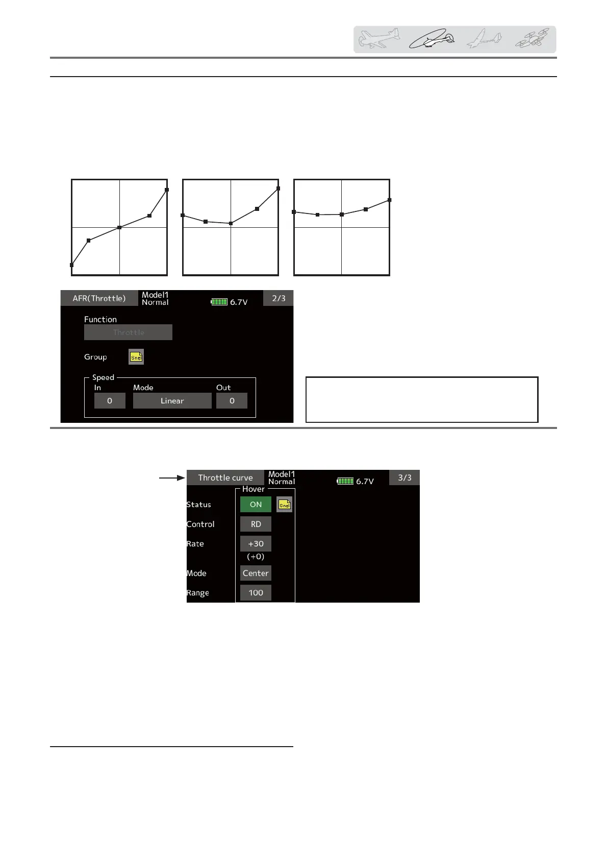 The Throttle Hover trim setup screen can be called from the Throttle curve setup screen.