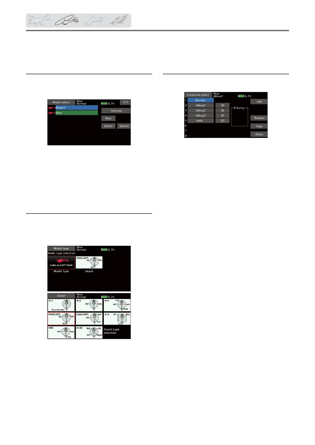 This section outlines examples of use of the helicopter functions of the FX-36. Adjust the actual values, etc. to match