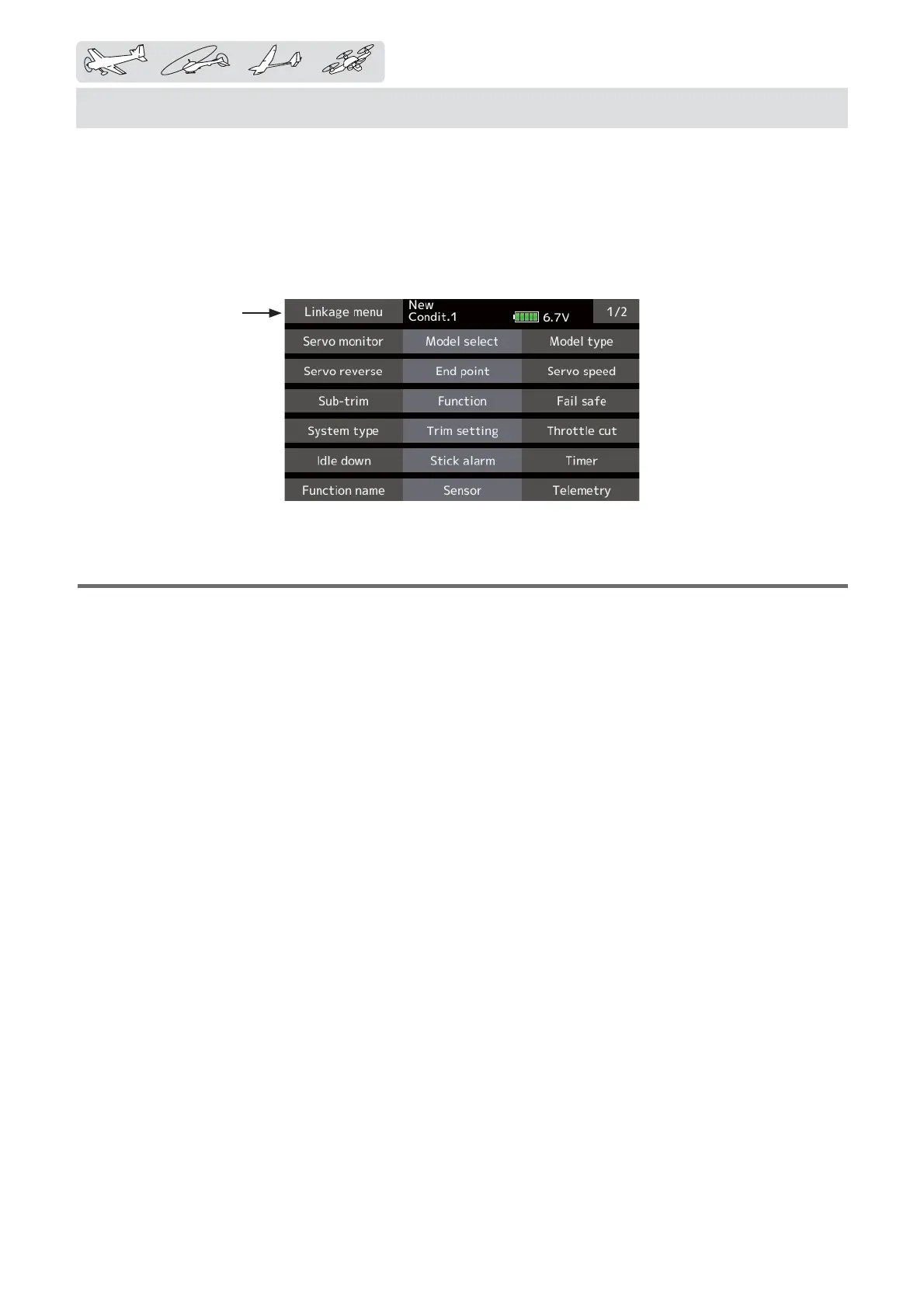 [Stick alarm]: Can be set so that an audible alarm sounds when the throttle stick reaches the set position.