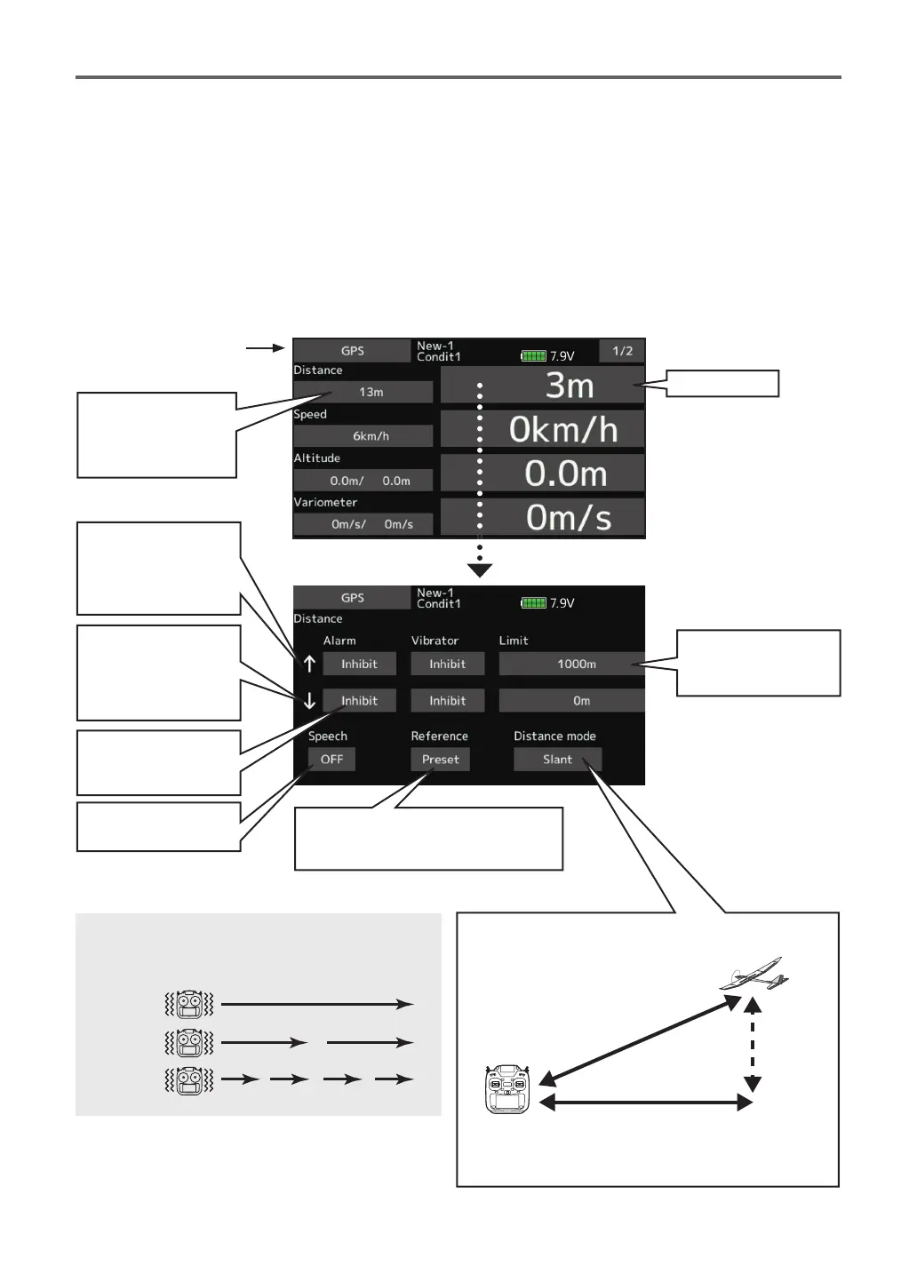 The Distance screen displays and sets altitude data