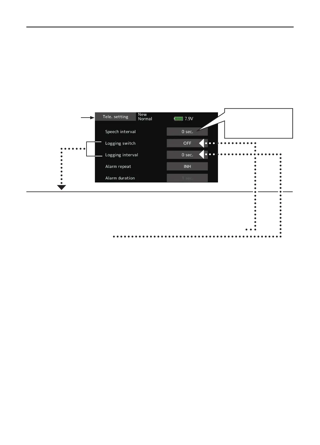 Set the switch set by Logging switch to OFF. A beeping sound is generated and recording of the telemetry data stops.