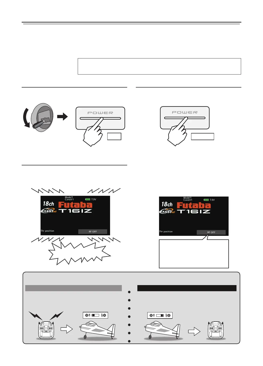 When turning on the power, the T16IZ transmitter will begin emitting RF automatically after it conrms