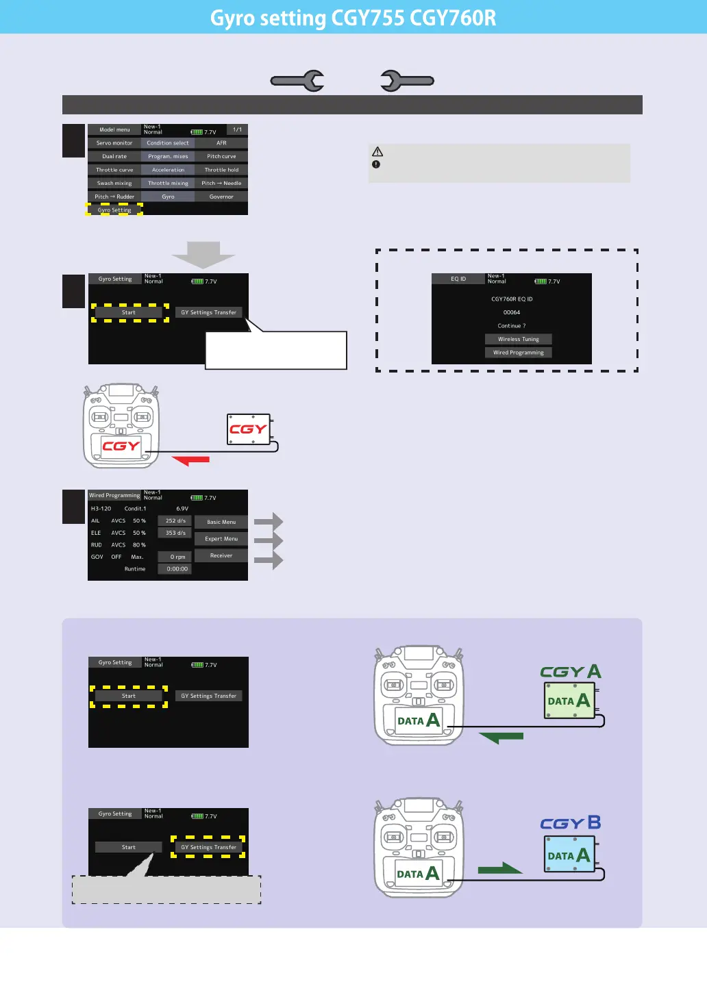 Connect Gyro B to T16IZ and press [GY Settings Transfer]. (Put data on A into gyro B)