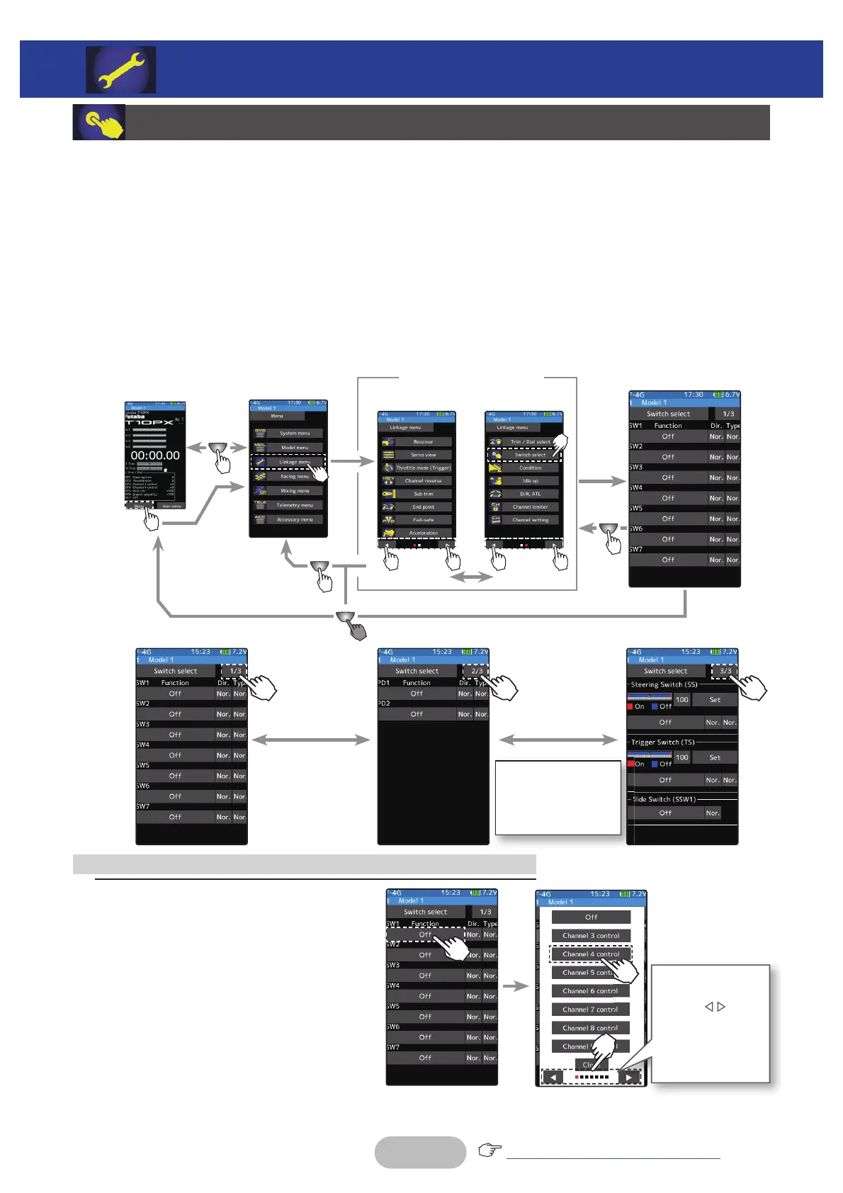 (SW1-SW7, PD1, PD2, SSW1, steering wheel, throttle trigger) and setting of the direc-