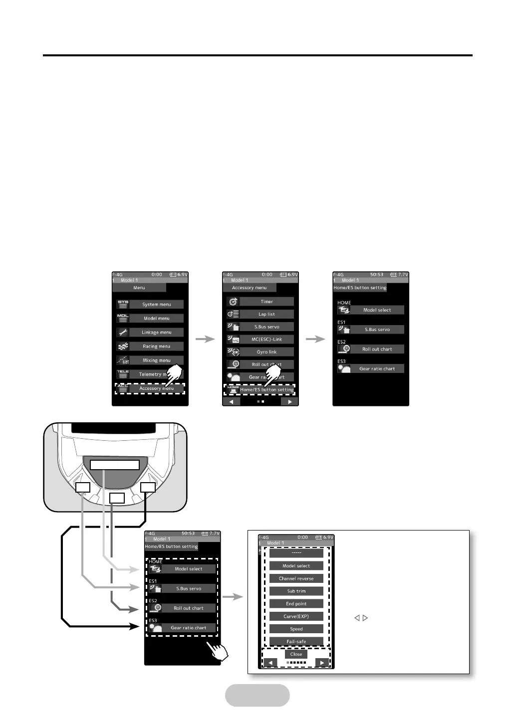 (Menu screen) (Accessory menu screen) (Home/ES button setting screen)