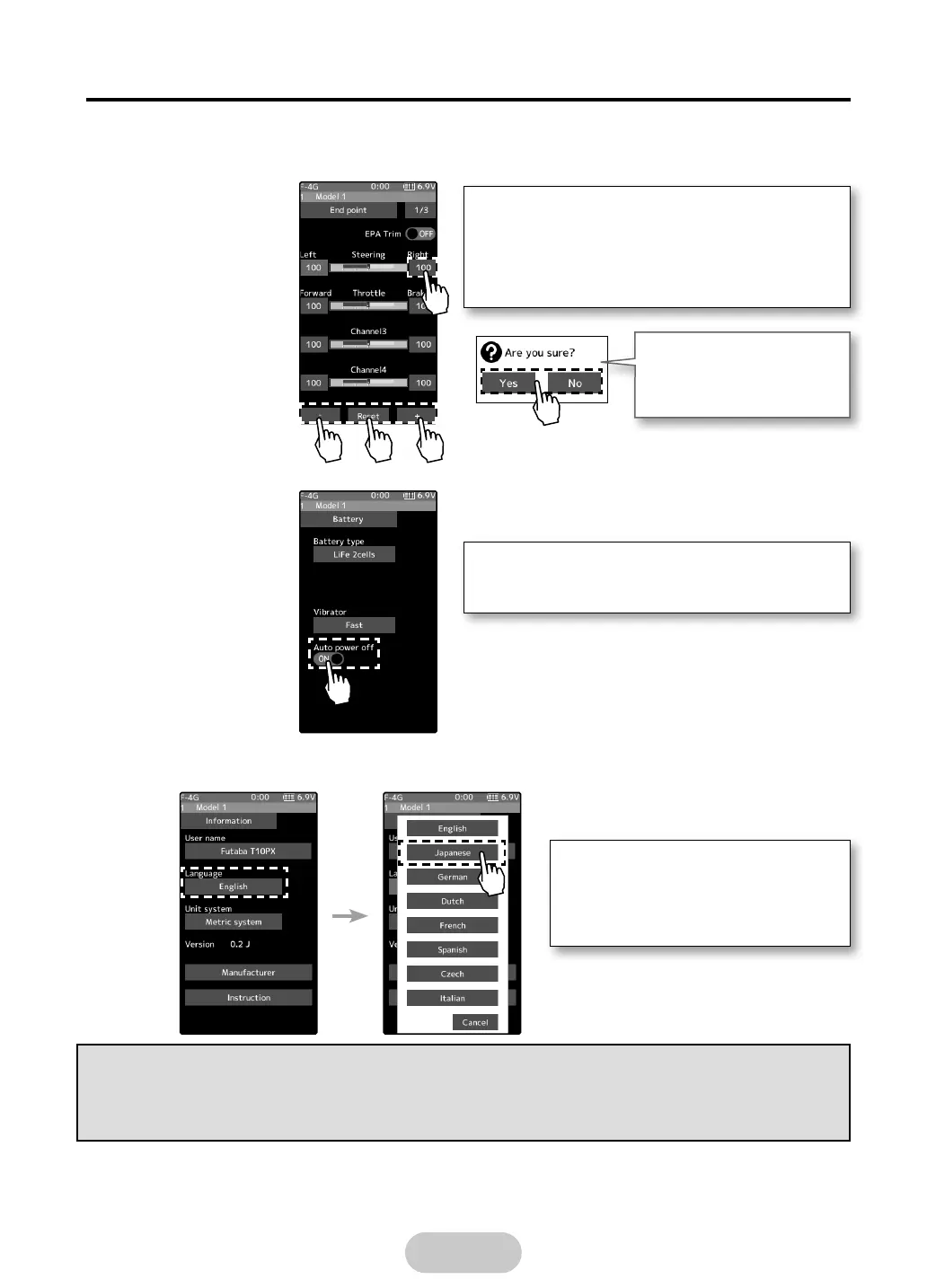To select a function form multiple items such as language, tap the function on the screen.
