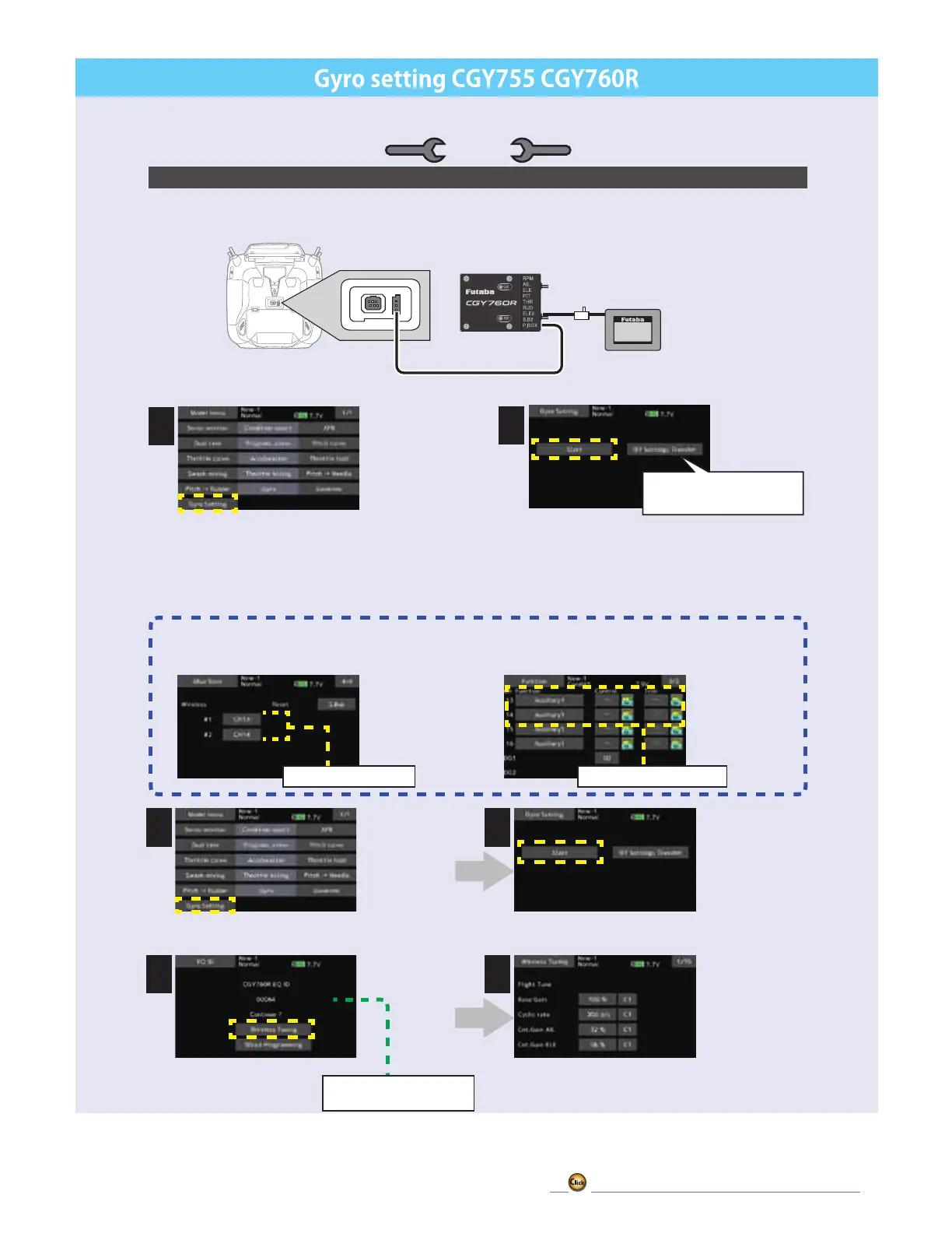 Before making Wireless tunings, it is necessary to download the setting data from the gyro to the T16IZ via a wired