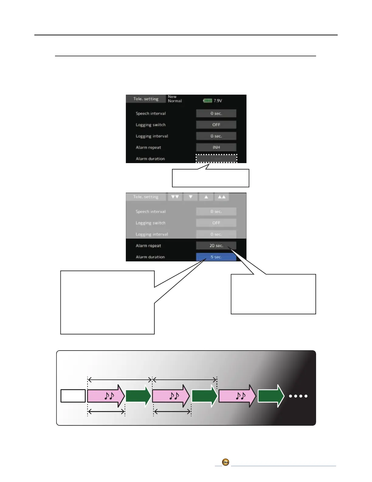 The repeat time and duration time for the telemetry alarm (buzzer, vibration and speech) can be set.