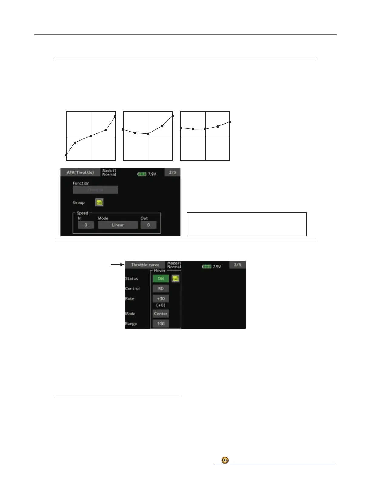 The Throttle Hover trim setup screen can be called from the Throttle curve setup screen.
