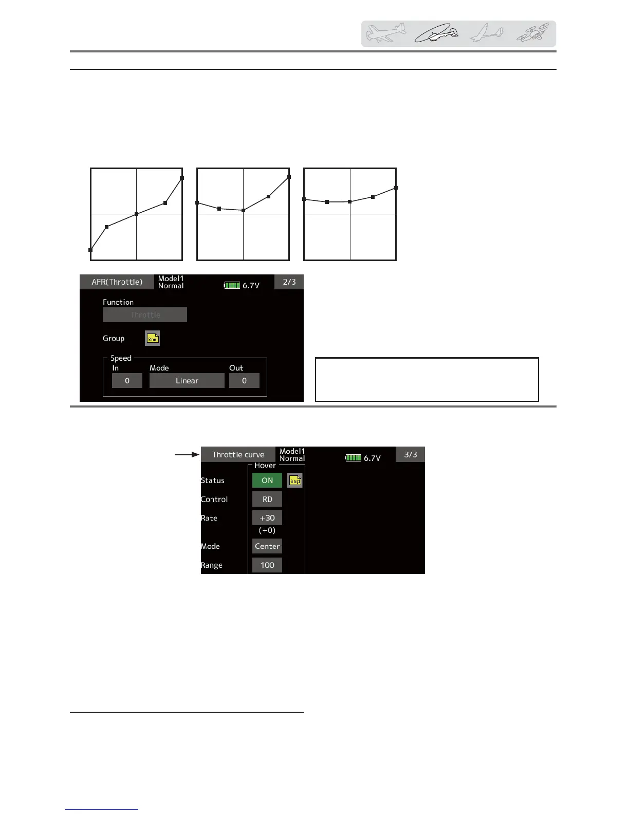 The Throttle Hover trim setup screen can be called from the Throttle curve setup screen.