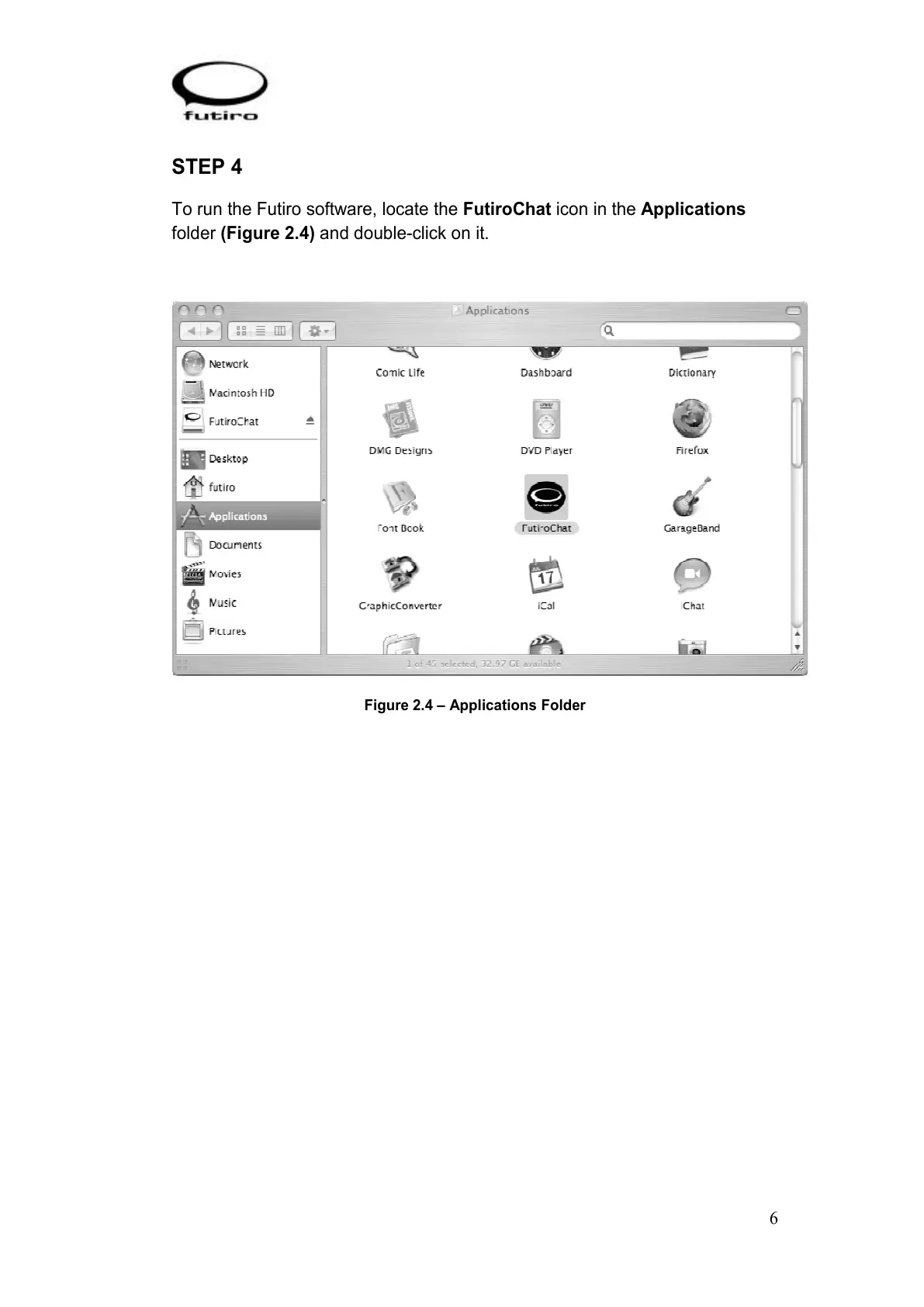 To run the Futiro software, locate the FutiroChat icon in the Applications