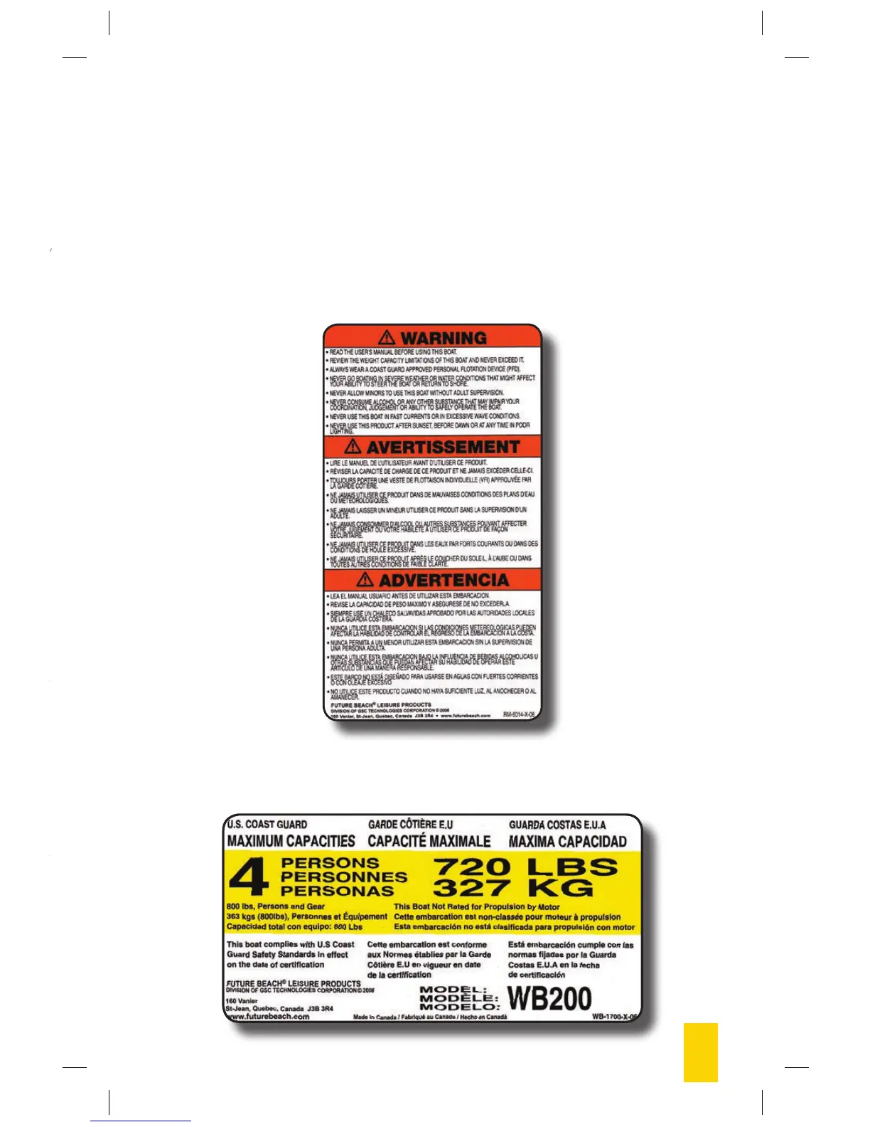 Safety Information on Labels : Your pedal boat comes with the following labels