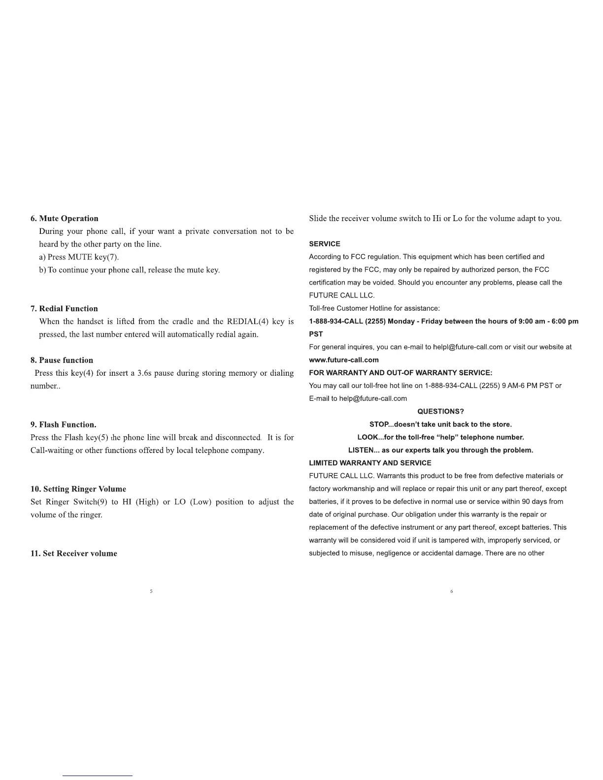Future Call FC-1507 - Advanced Operation Functions; Volume and Receiver Settings; Service and Warranty Information; Customer Service Contact